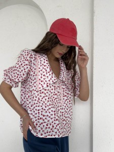 Bawełniana koszula z kołnierzykiem w czerwone kwiatki z pudrową tasiemką Purpura