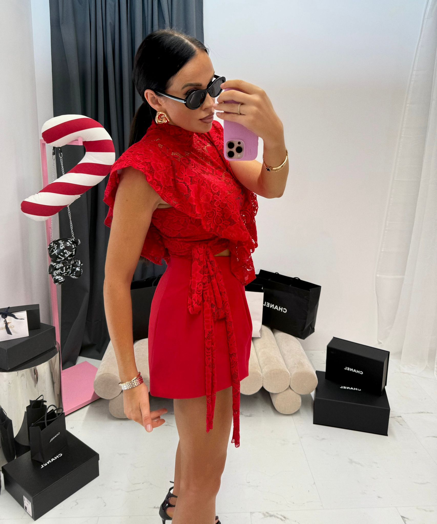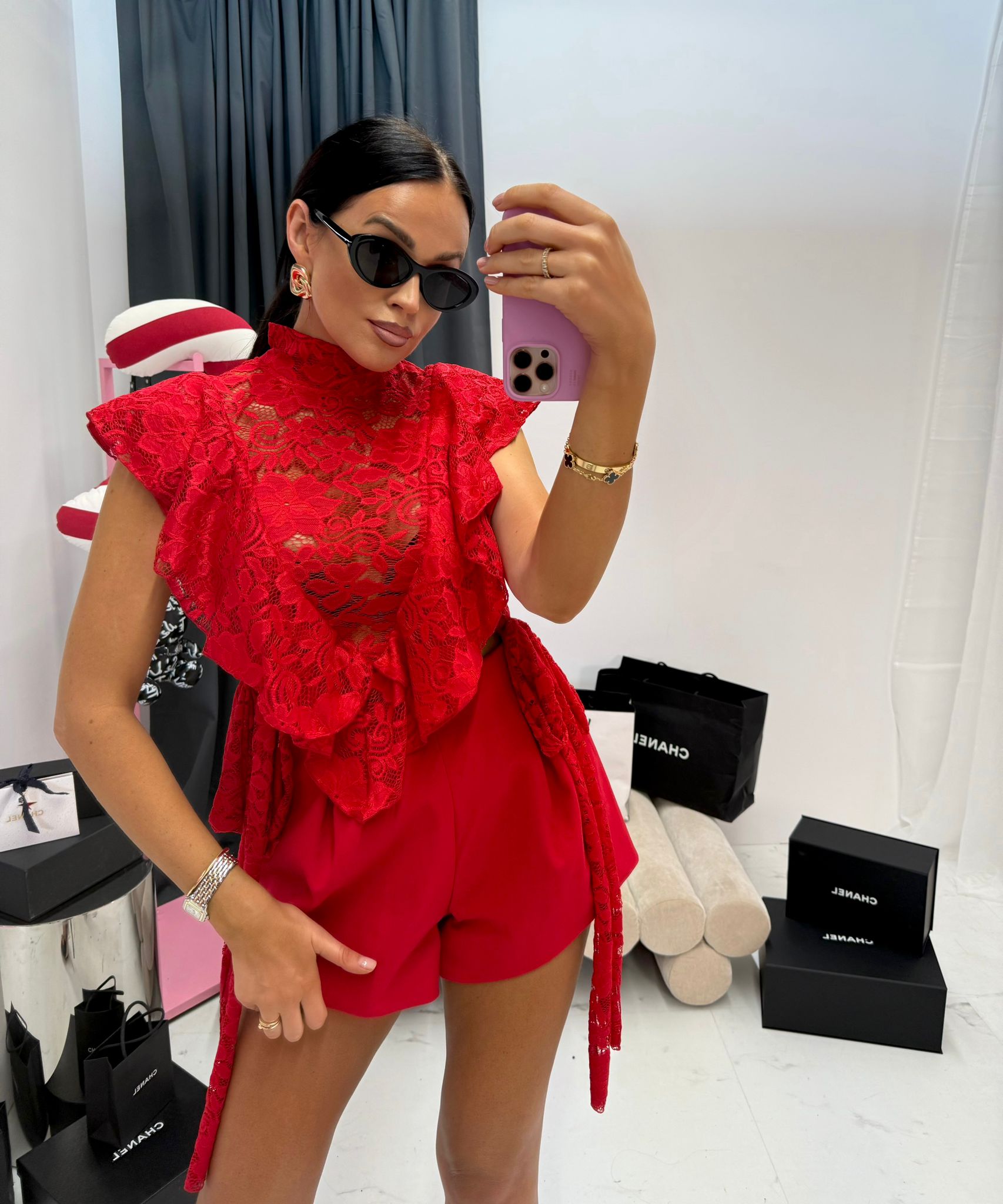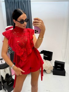 Bluzka koronkowa La Milla czerwona to idealna propozycja dla Pań szukających wyróżniających się stylizacji. Bluzka koronkowa czerwona ma szerokie ramiączka i charakteryzuje się dodatkową koronkową falbanką z przodu. Po boku bluza ma wiązania, dzięki czemu można zrobić ciekawe wiązana na różne sposoby. Bluzka koronkowa La Milla świetnie sprawdzi się z koronkową spódniczką czy spódnico spodenkami koronkowymi. Dopasujesz do niej również nasze spodenki lub spódnico-spodenki La Milla w kolorze czerwonym tworząc idealny zestaw. Na bluzkę koronkową możesz zarzucić marynarkę Wigilia. Idealna propozycja na wieczorne wyjście.