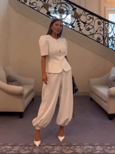 Elegancki biały komplet marynarka i spodnie EMO Touch - elegancka, taliowana marynarka damska EMO z rękawem do łokcia i spodnie EMO o kroju alladynek - elegancki komplet premium polskiej produkcji