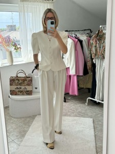 Spodnie w kant EMO śmietankowe to elegancka propozycja dla Pań ceniących sobie styl i komfort. EMO eleganckie spodnie z szeroką, prostą nogawką to idealny wybór na formalne spotkania jak i codzienne wyjścia. Wysoki stan spodni i szerokie nogawki dodają całej stylizacji eleganckiego wyglądu. Spodnie posiadają kieszenie i są zapinane na guzik.