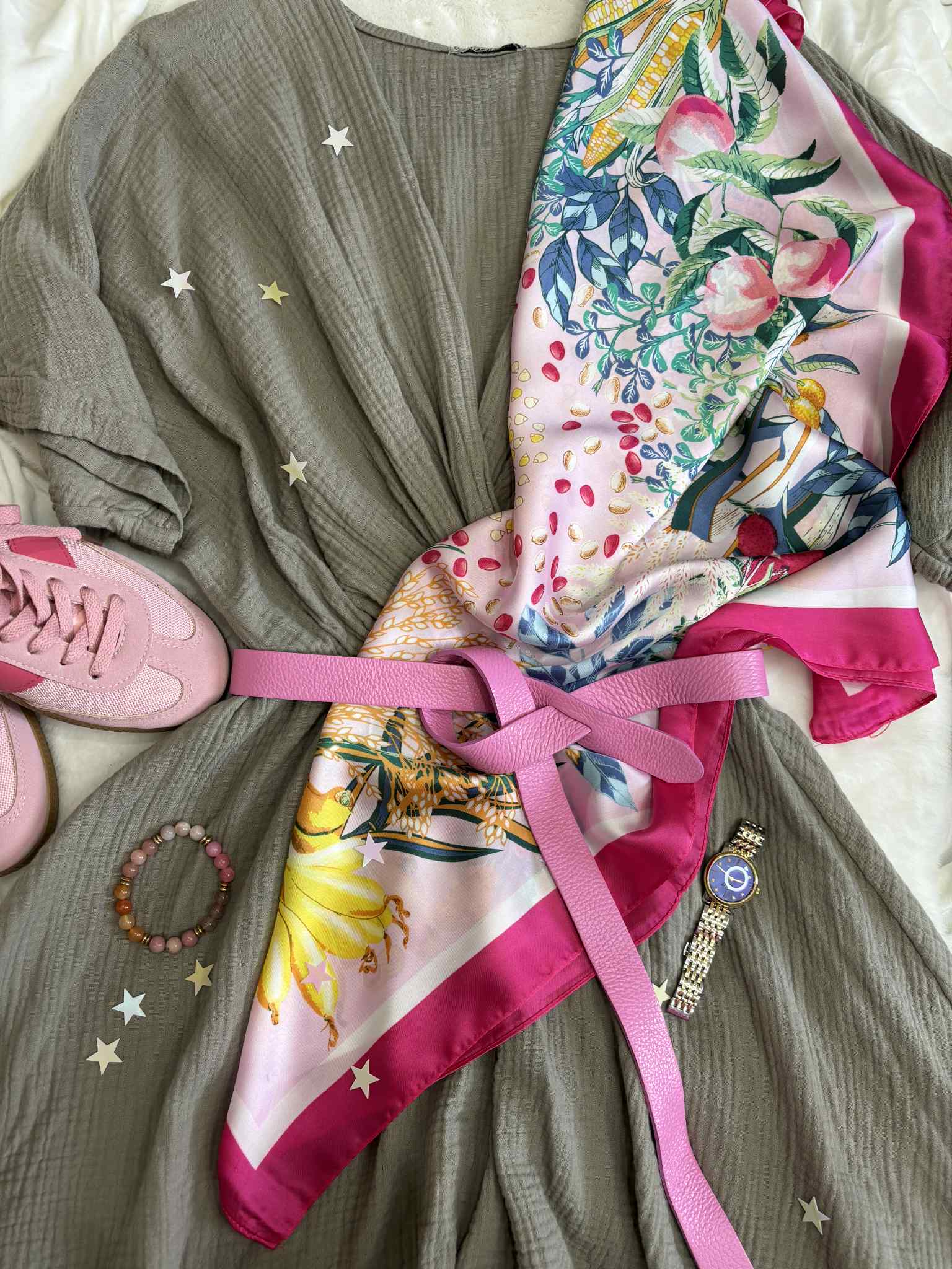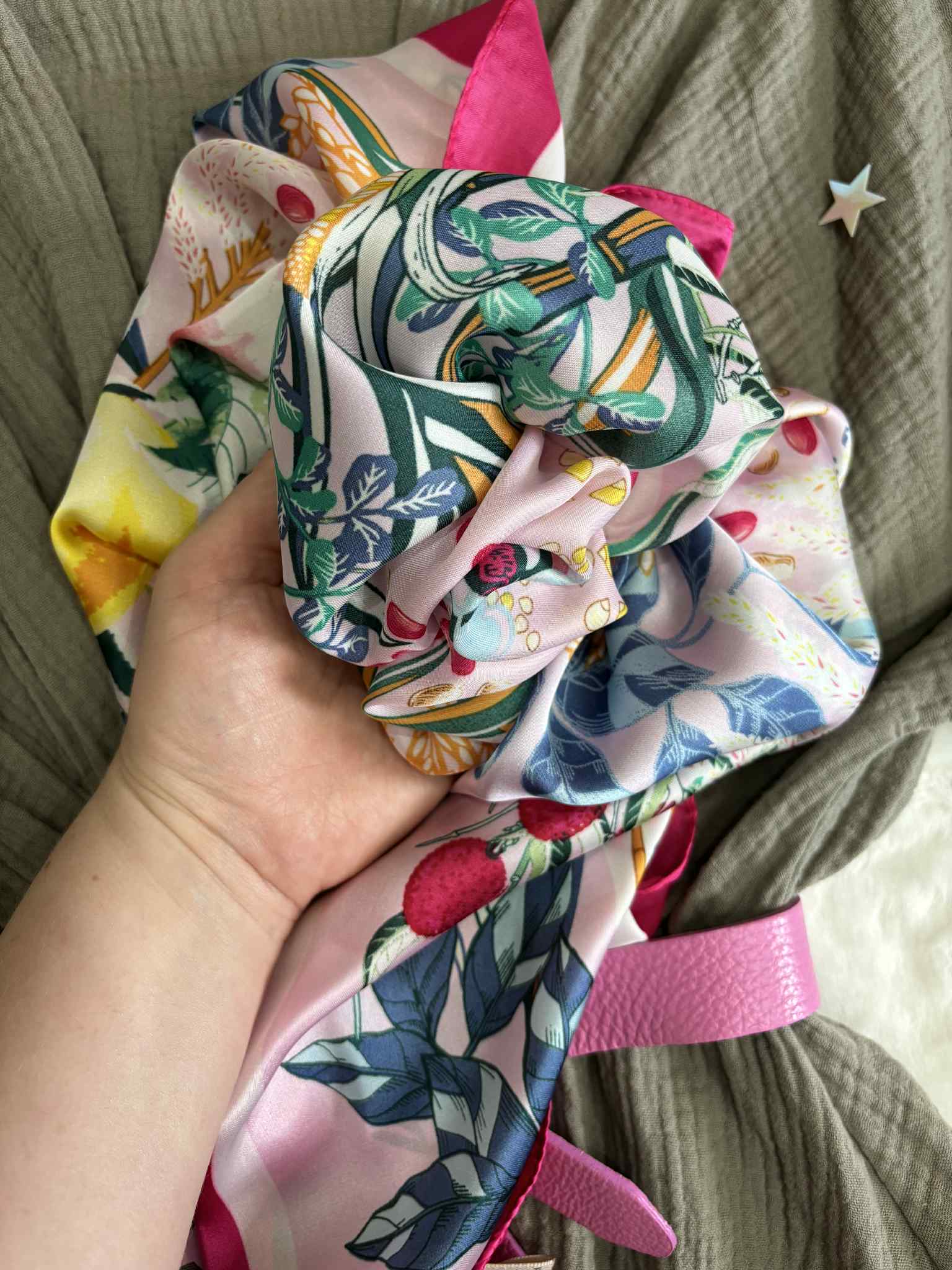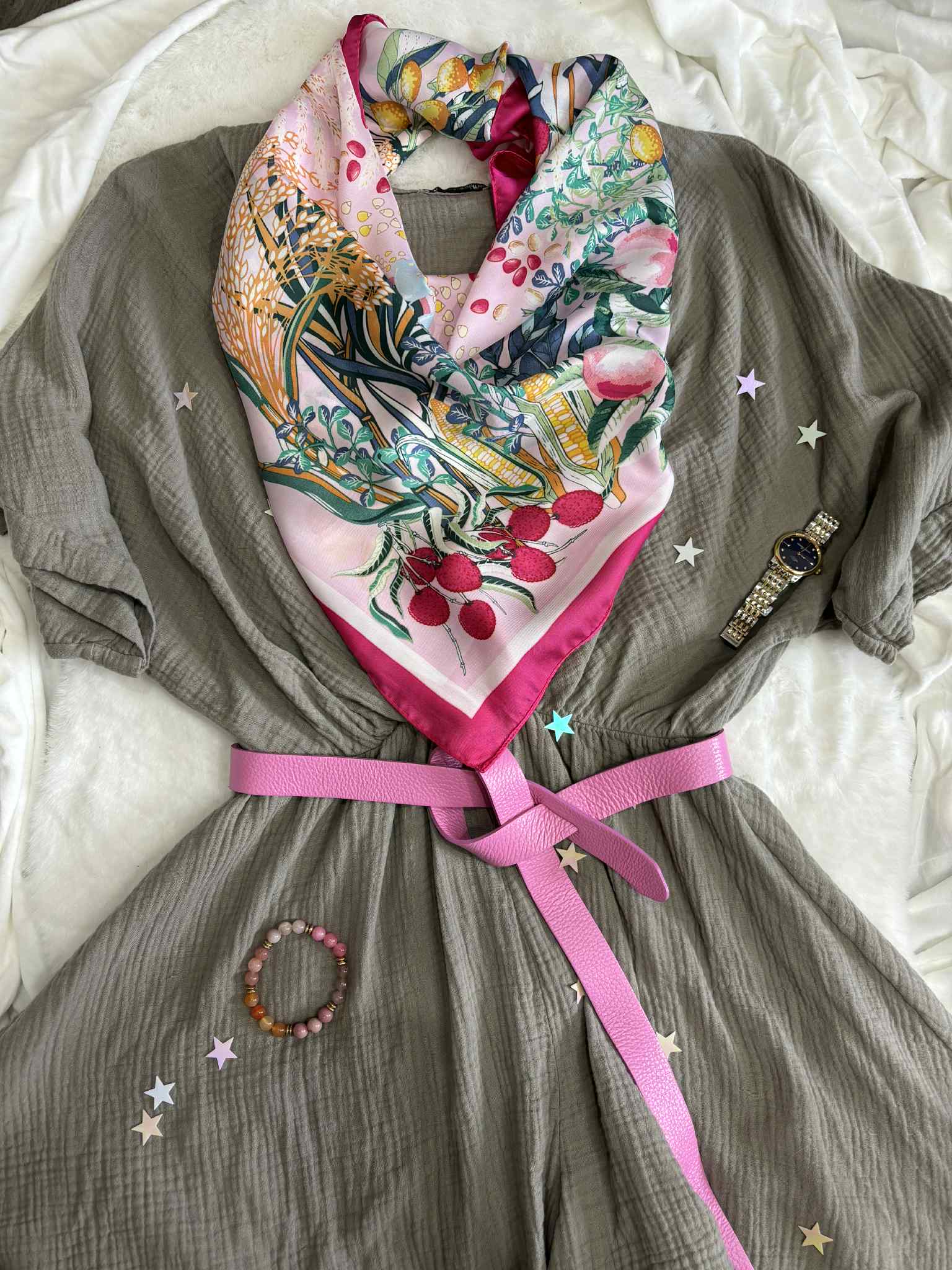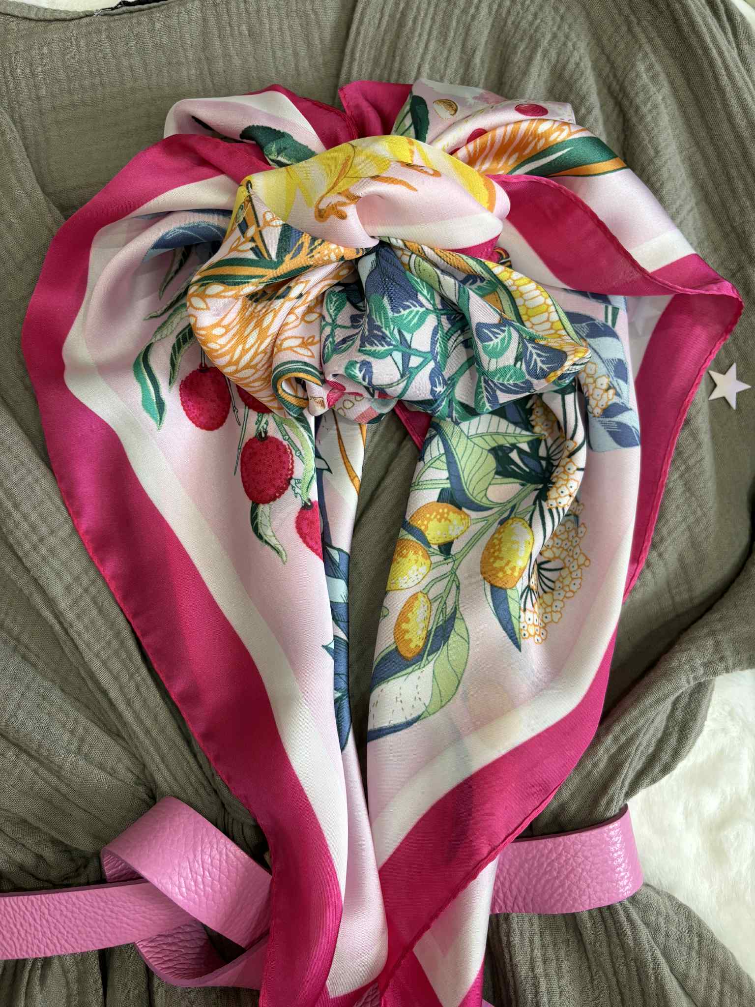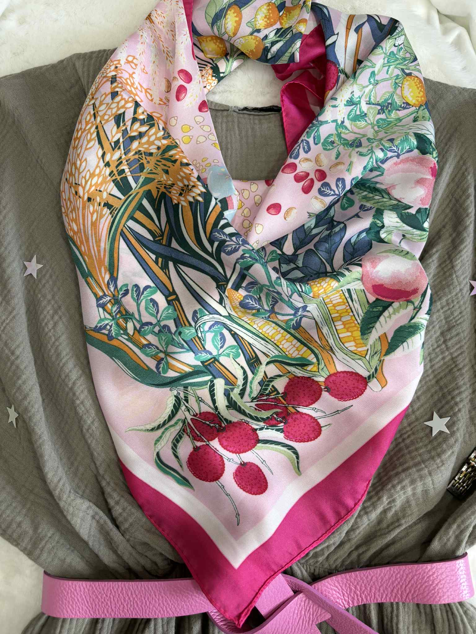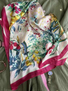 Gawroszka z różowo zielonymi elementami w kwiatowo owocowy wzór. Apaszkę gawroszkę wykorzystasz na kilka sposobów: przy torebce, na szyję lub na głowę.