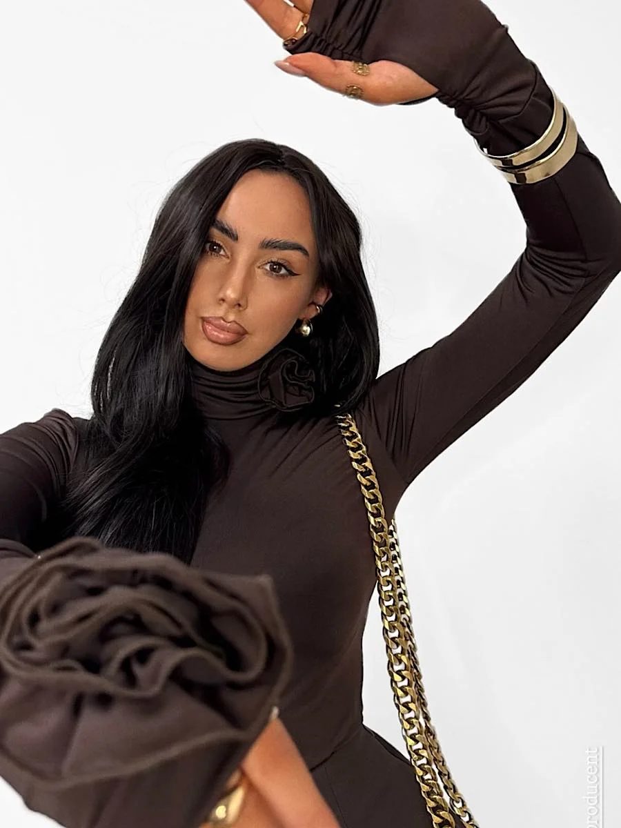 Golf La Milla z różą brązowy to bawełniany gładki model bluzki z golfem wykonany z niezwykle przyjemnego dla ciała materiału. Idealnie dopasowuje się do sylwetki podkreślając jej atuty. Golf La Milla posiada różę przy golfie i długie rękawy, a jeden z nich jest również zakończony różą. Model posiada delikatne poduszki na ramionach. Postaw na niezwykle kobiecy i zmysłowy model. Do golfu La Milla możesz również dobrać spódnico-spodenki lub spodenki brązowe tworząc elegancki look.