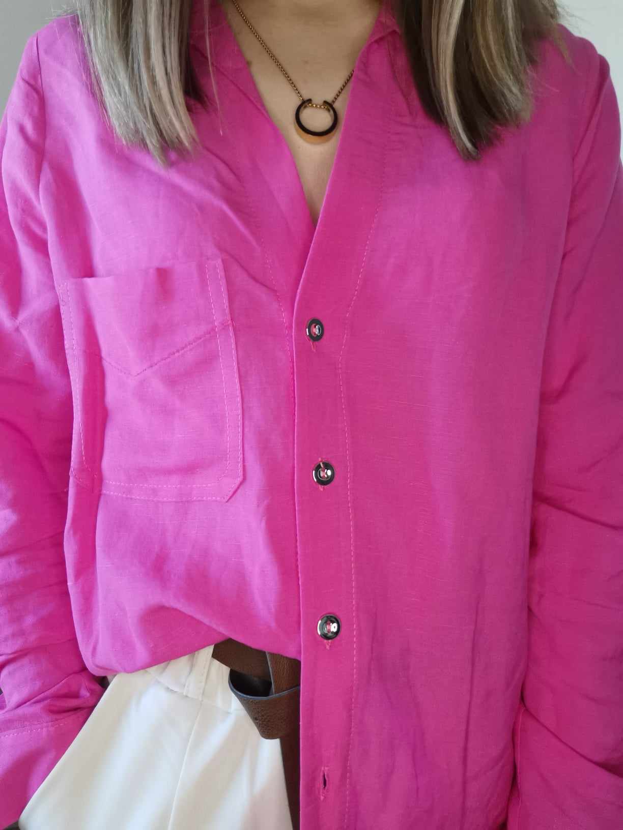 Koszula różowa wykonana z wiskozowego materiału o klasycznym kroju. Wiskozowa koszula z domieszką lnu świetnie sprawdzi się przez cały rok, również w upalne dni. Rękawy posiadają guziki co pozwala na ich podwinięcie. Ciekawie wycięty dekolt w kształcie litery V. Casualowa koszula nadaje stylowy i świeży wygląd. Wykorzystasz pod marynarki, do jeansów, spodni materiałowych lub spódnic. Biała koszula świetnie sprawdzi się również narzucona na kostium kąpielowy.