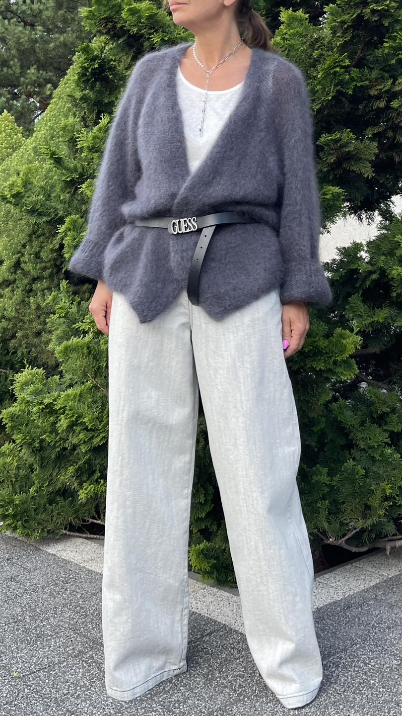 Kardigan moherowy damski grafitowy – miękki, puszysty i elegancki kardigan z moheru, idealny na jesień i zimę.