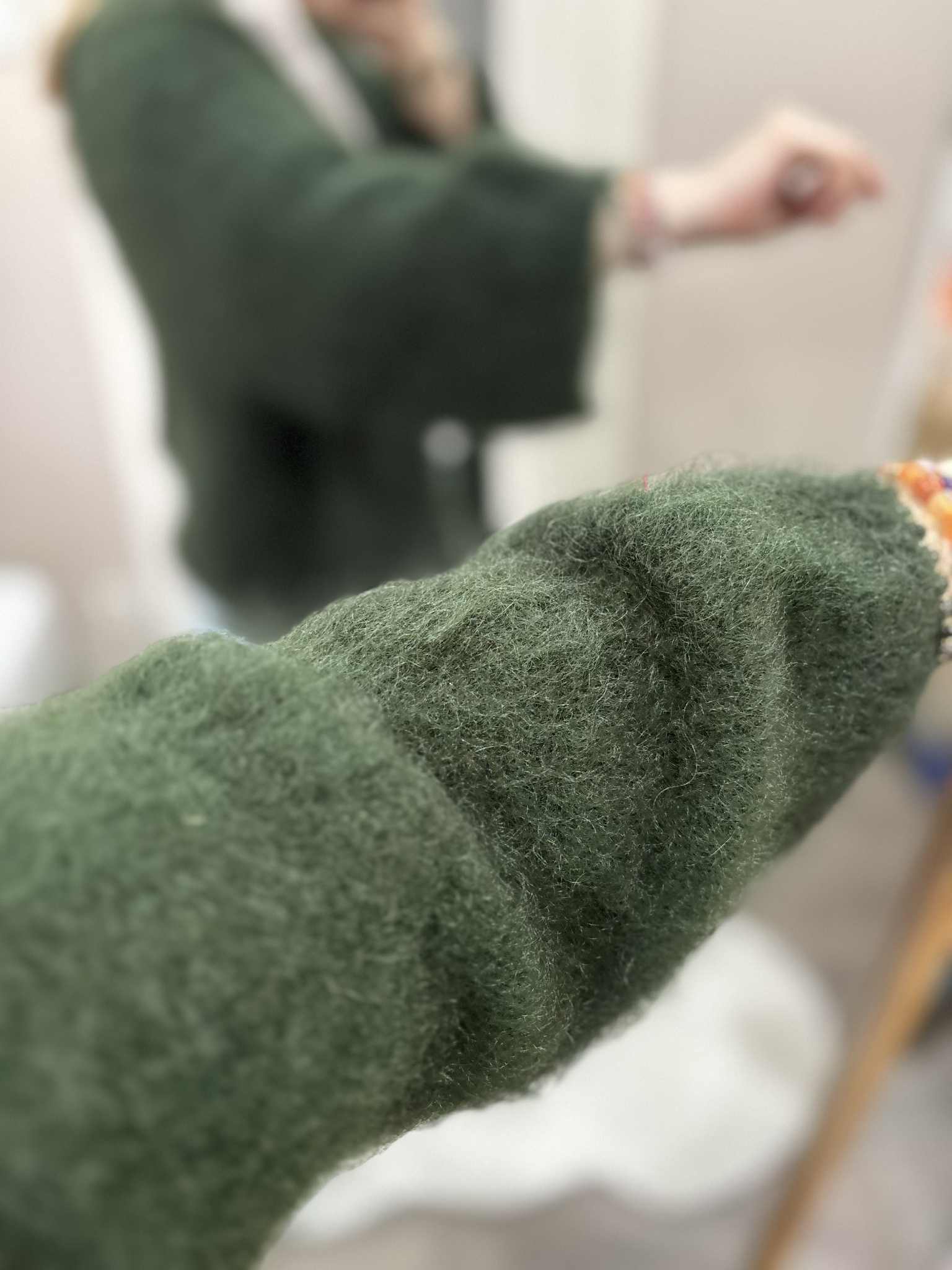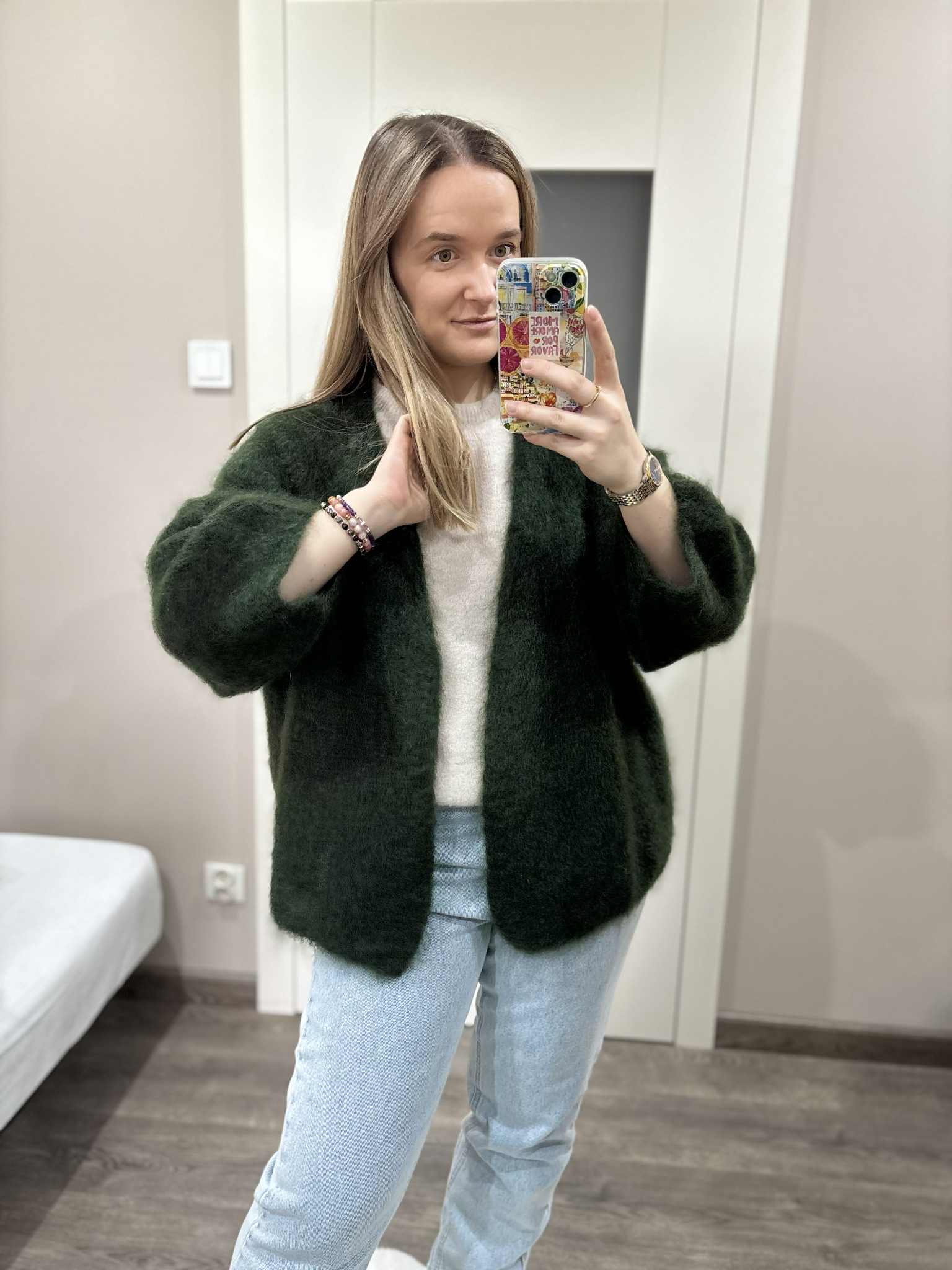 Kardigan moherowy damski khaki/butelkowa zieleń – miękki, puszysty i elegancki kardigan z moheru, idealny na jesień i zimę.