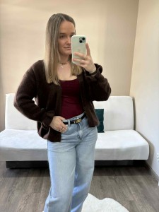 Długi rękaw z obniżoną linią ramion jest wykończony ściągaczem tworząc uroczą falbankę. Kolor czekoladowy to hit tego sezonu, świetnie komponuje się z innymi kolorami, zarówno jasnymi, jak i ciemnymi. Kardigan baby alpaka można nosić na wiele sposobów – zarzucony na ulubiony t-shirt, bluzkę czy na sukienkę. Końcówki kardiganu możesz również włożyć do spodni, co będzie tworzyć efektowny dekolt. To doskonały wybór na chłodne wieczory czy weekendowe spacery, łącząc styl z wygodą.