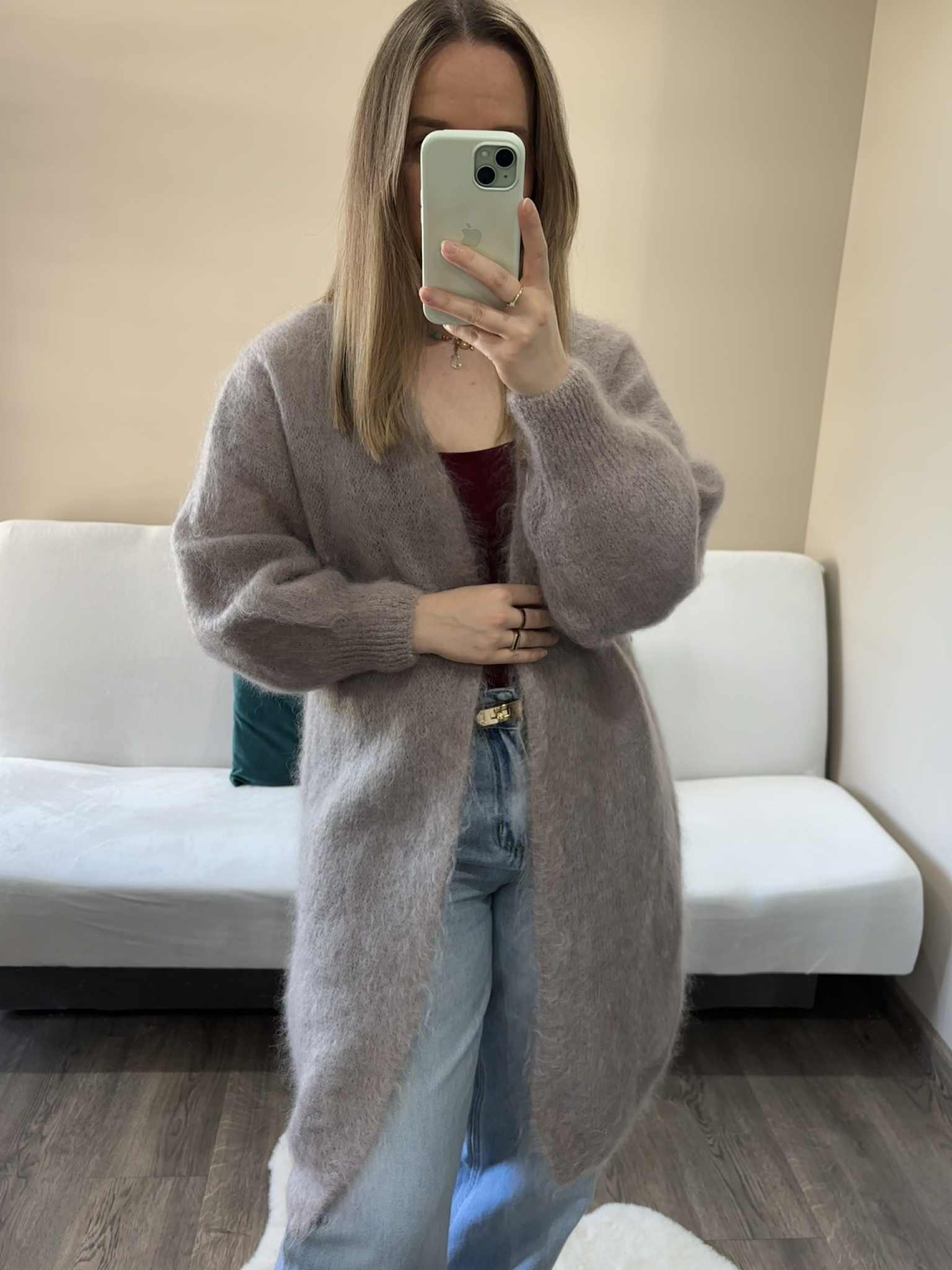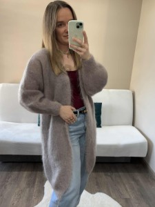 Długi kardigan moherowy damski szary – miękki, puszysty i elegancki kardigan z moheru, idealny na jesień i zimę.