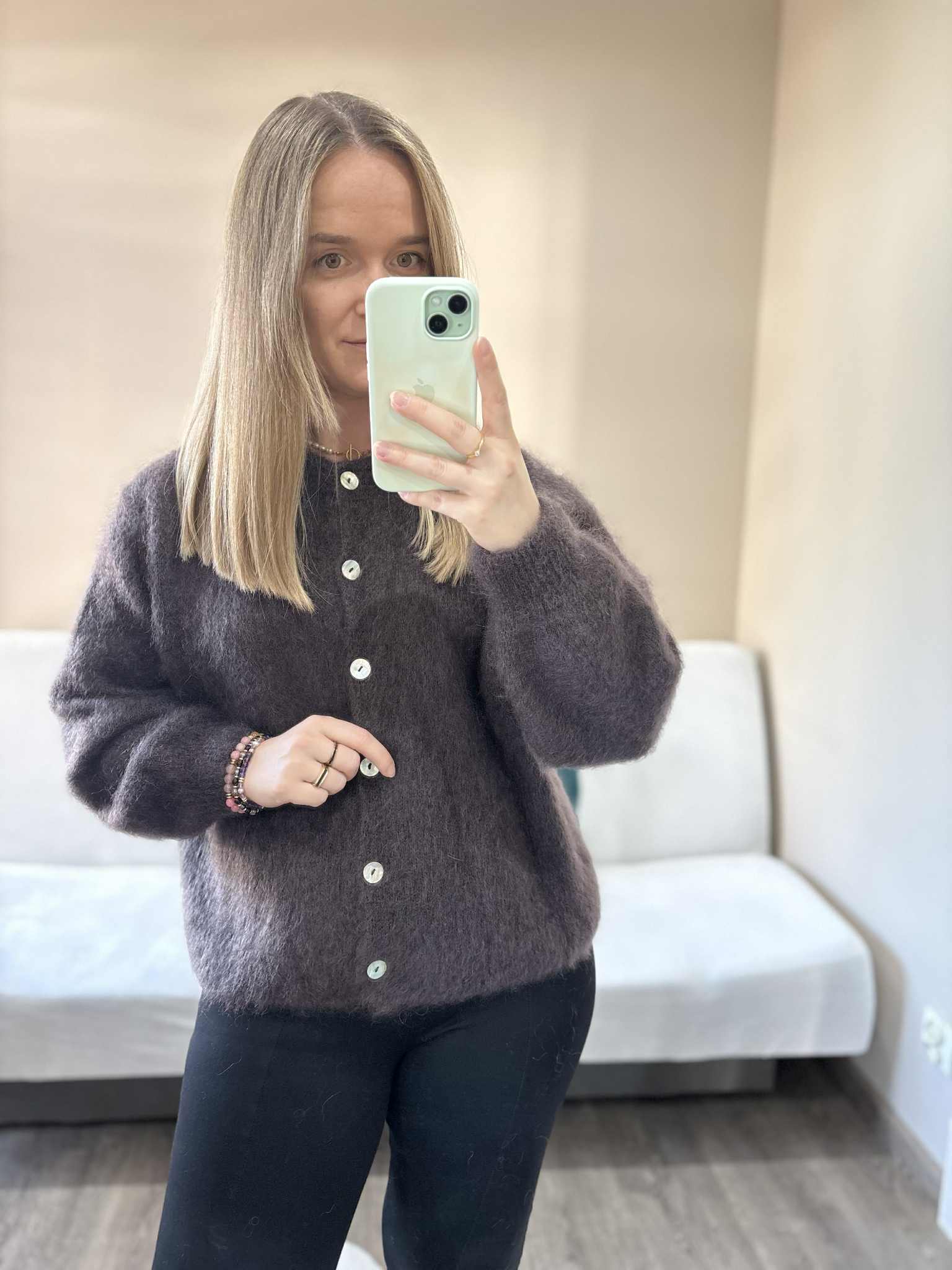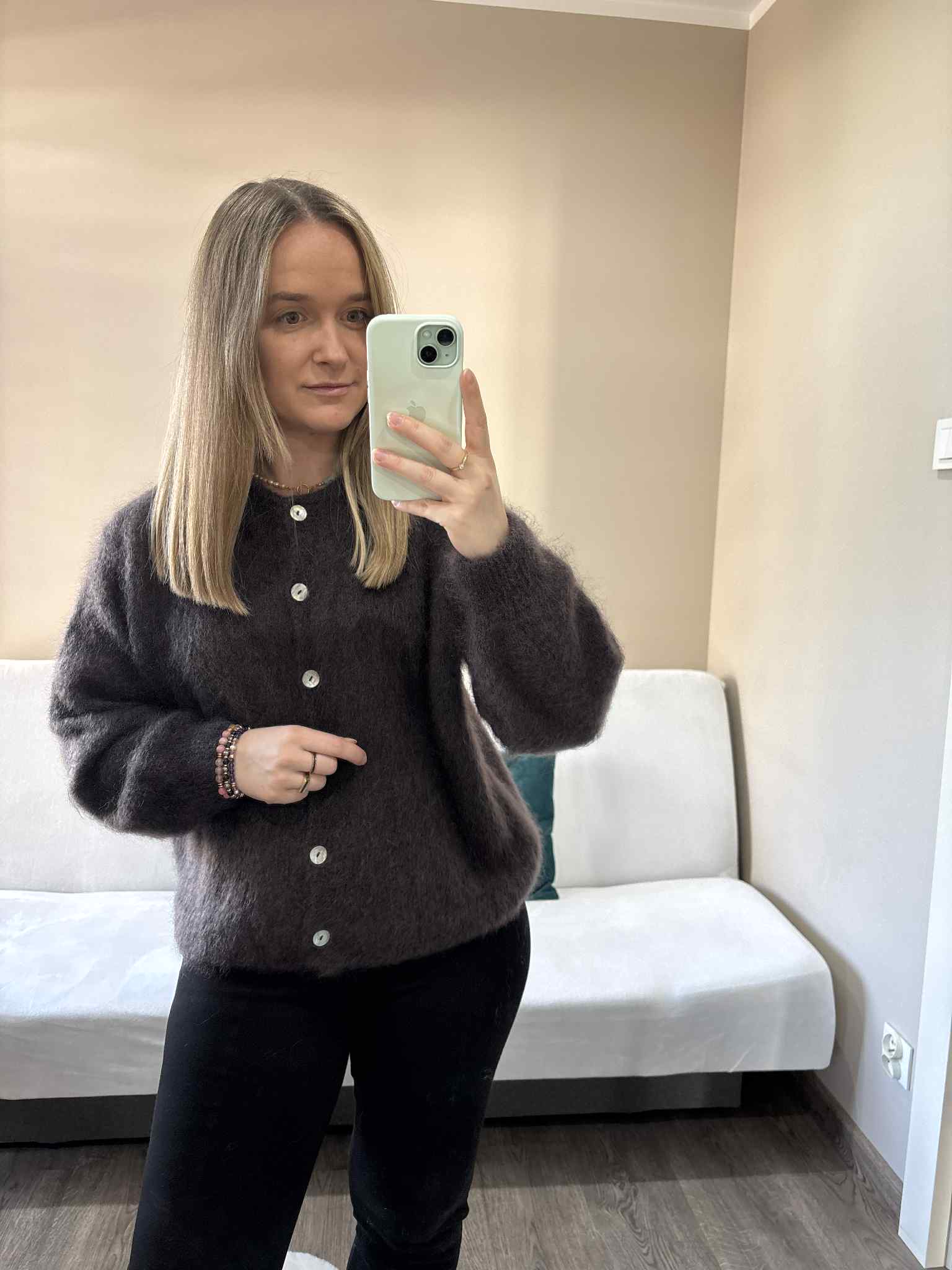 Długi rękaw wykończony ściągaczem tworzy delikatną bufkę. Kolor czekoladowy to hit sezonu - doskonale komponuje się z innymi kolorami, zarówno jasnymi, jak i ciemnymi. Kardigan kid moher można nosić na wiele sposobów – zapięty zarzucony na ulubiony t-shirt, bluzkę lub rozpięty na sukienkę, tworząc warstwowe, modne looki. Możesz go również ubrać tyłem na przód, co będzie tworzyć efektowny dekolt. To doskonały wybór na chłodne wieczory czy weekendowe spacery, łącząc styl z wygodą.