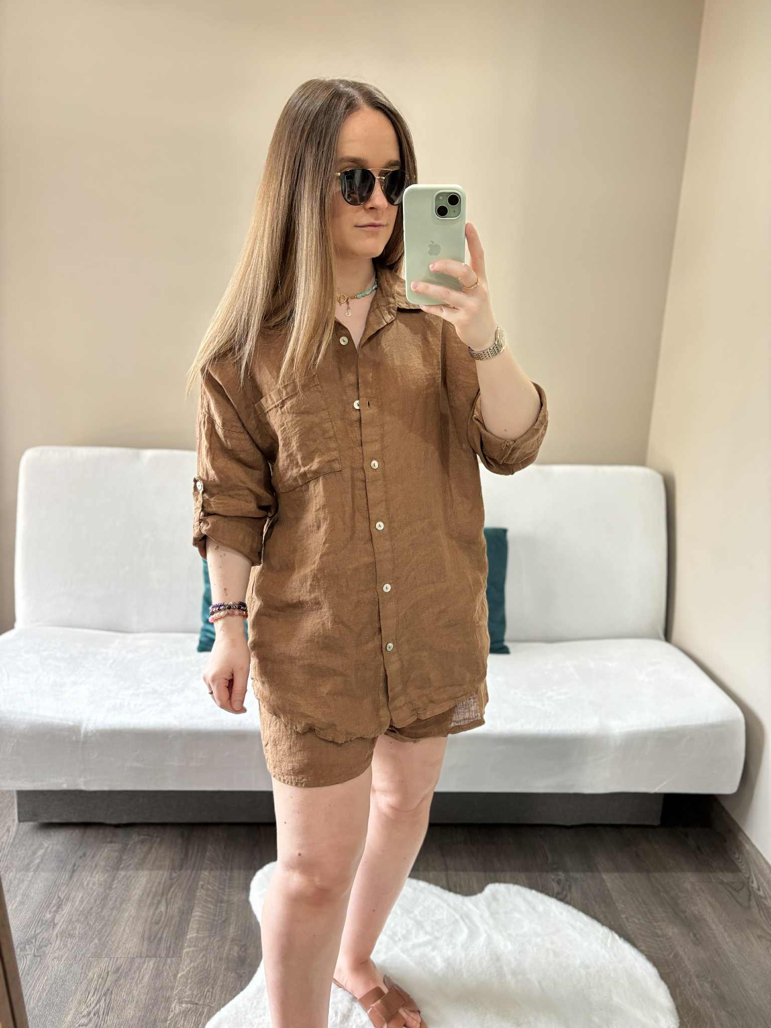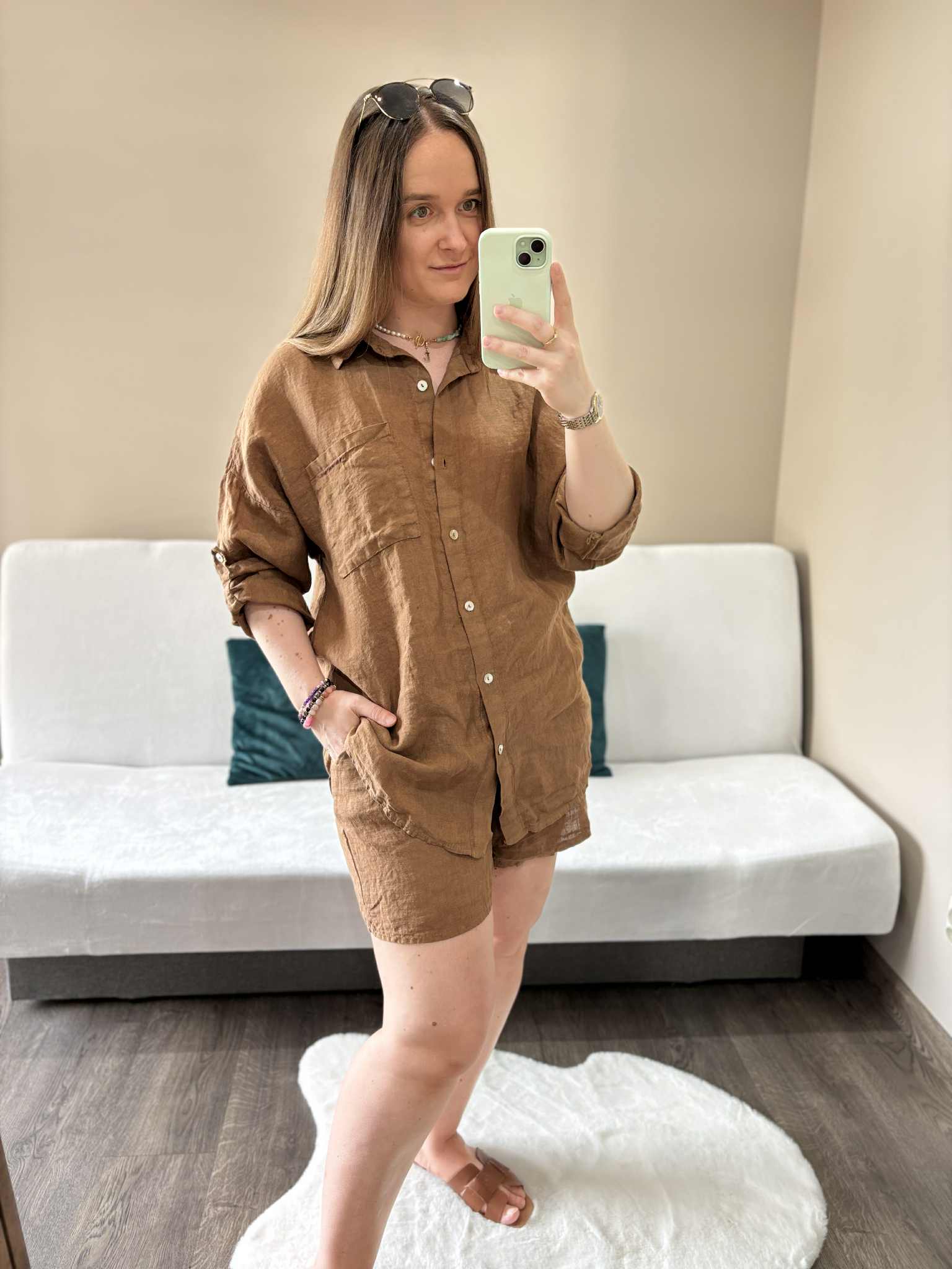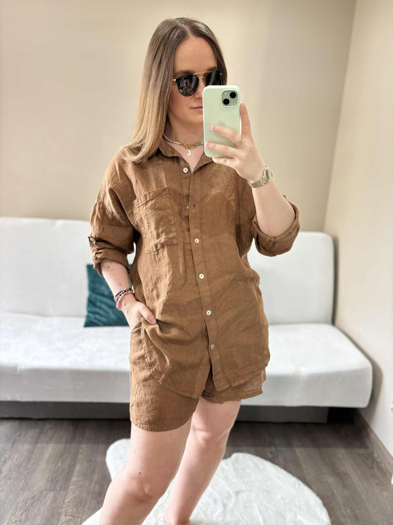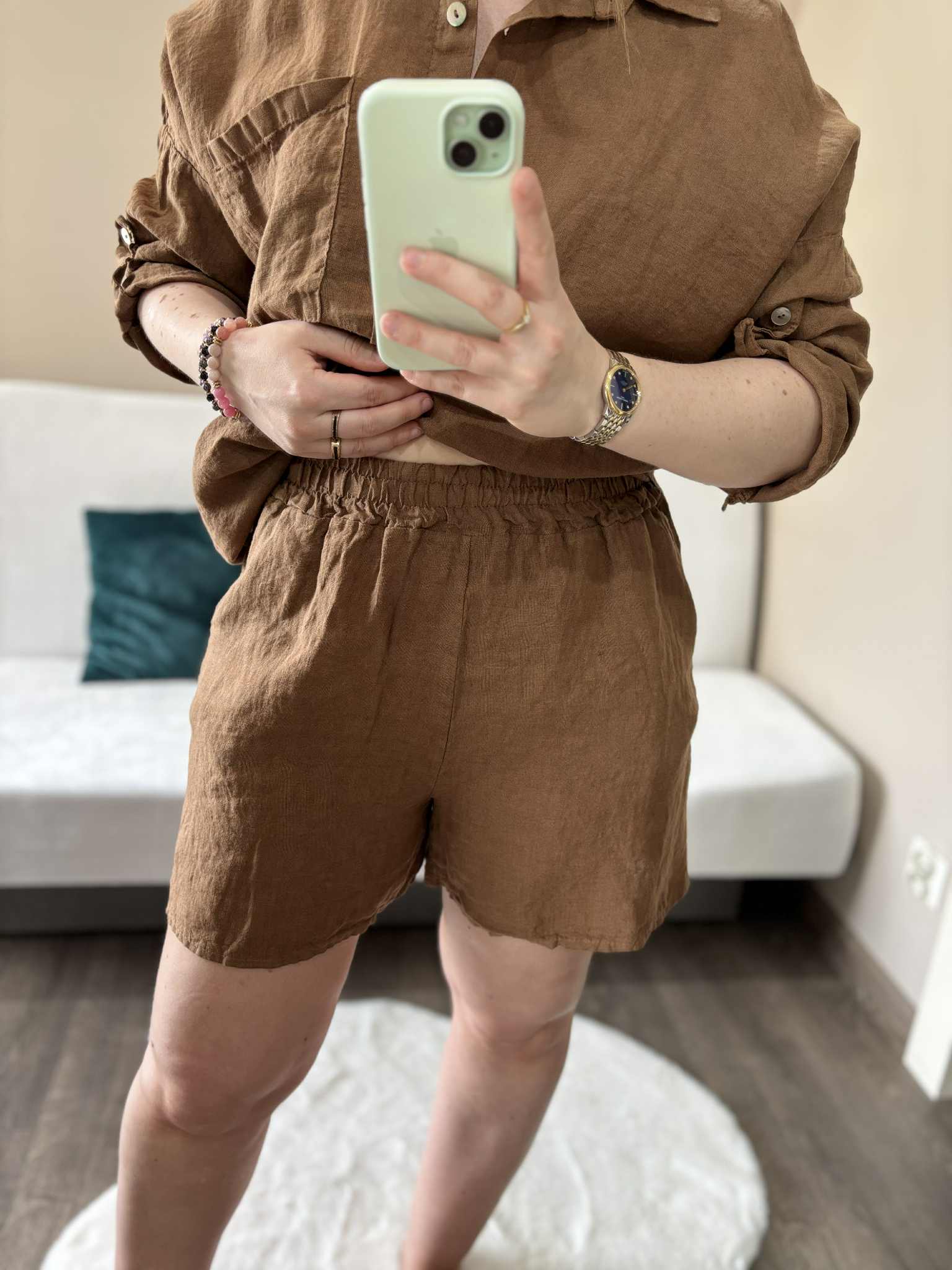 Modny lniany komplet damski w kolorze czekoladowym, który zapewni Ci wygodę i styl w ciepłe dni. Wykonany z przewiewnego, naturalnego materiału, doskonale sprawdzi się na lato, pozwalając skórze oddychać. Koszula zapinana na guziczki, długi rękaw w możliwością podwinięcia dzięki guzikowi na rękawie. Spodenki mają szeroką gumę w pasie i kieszenie.
