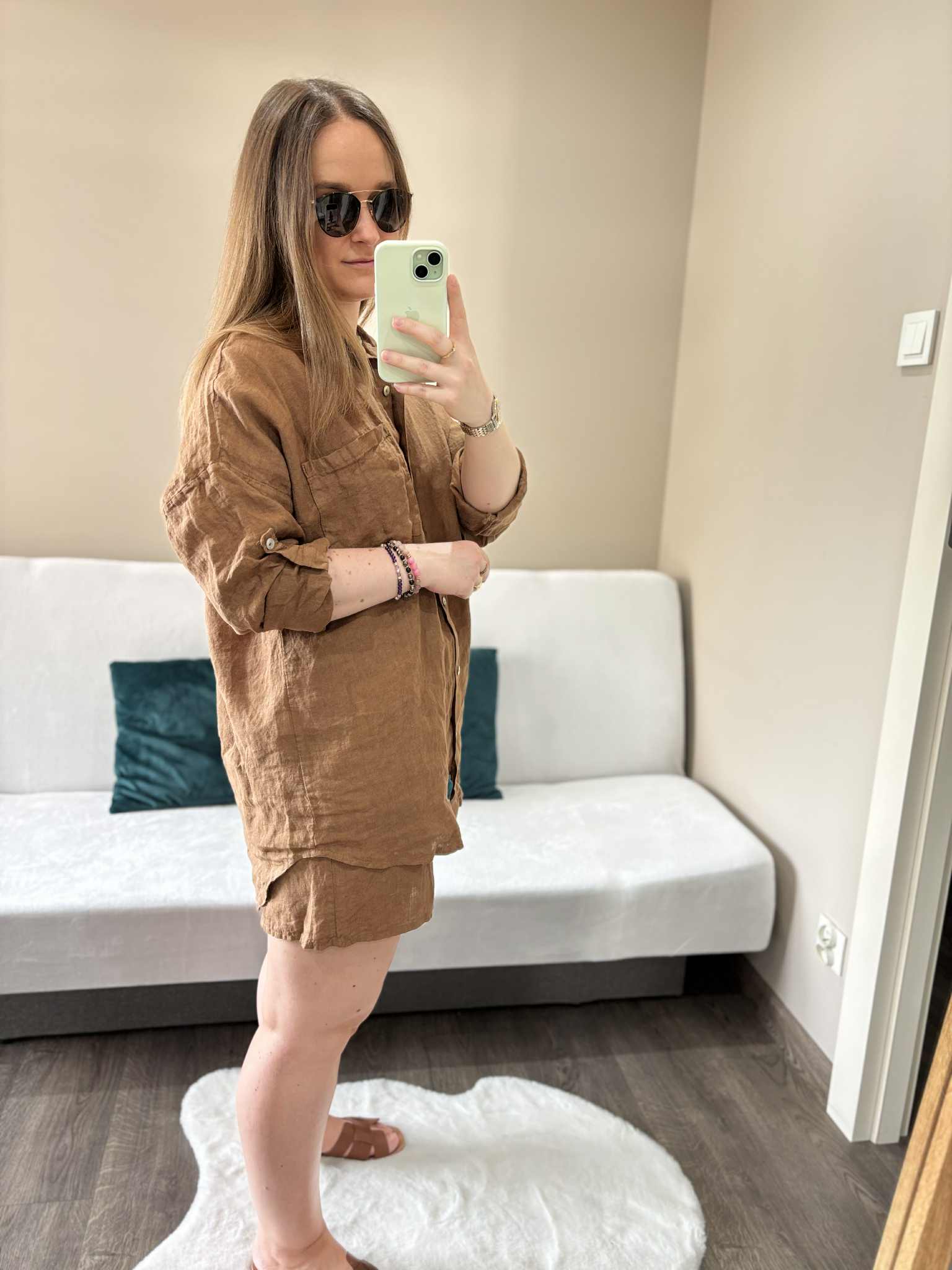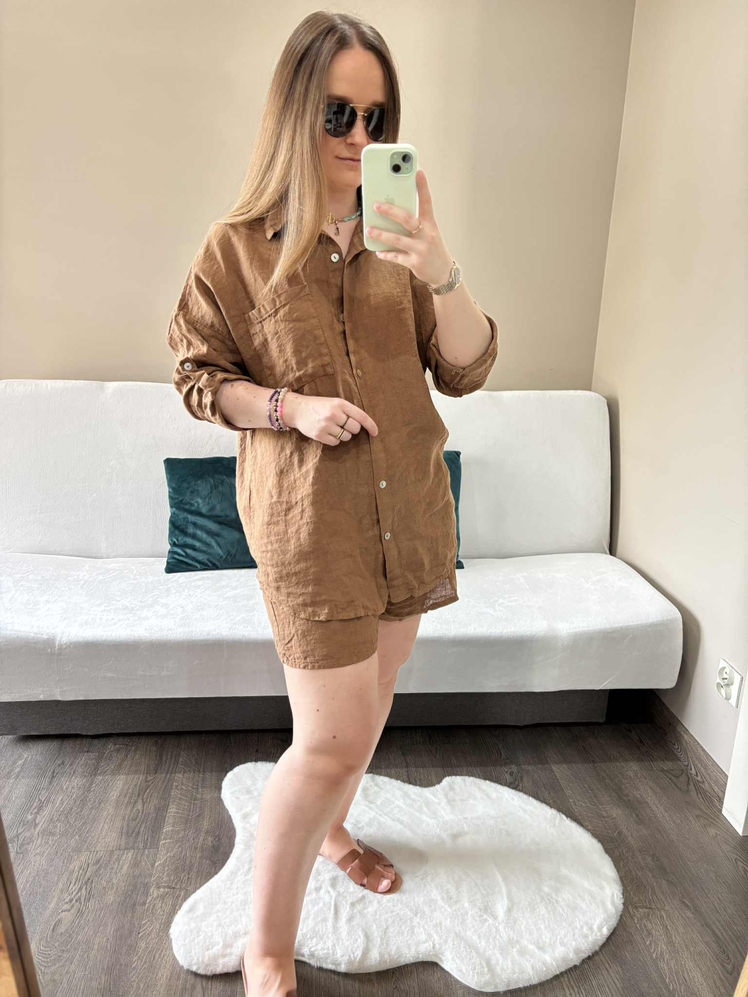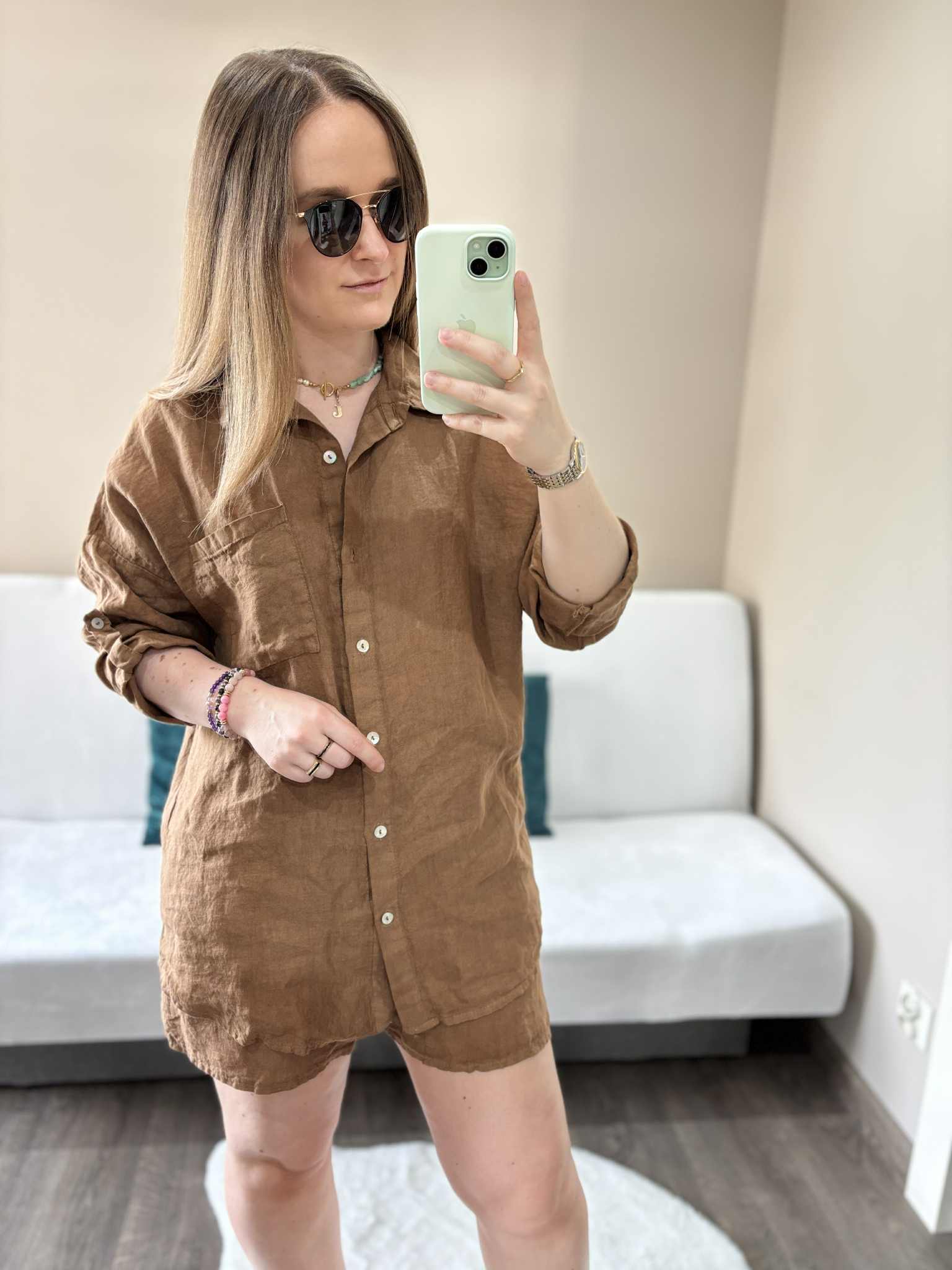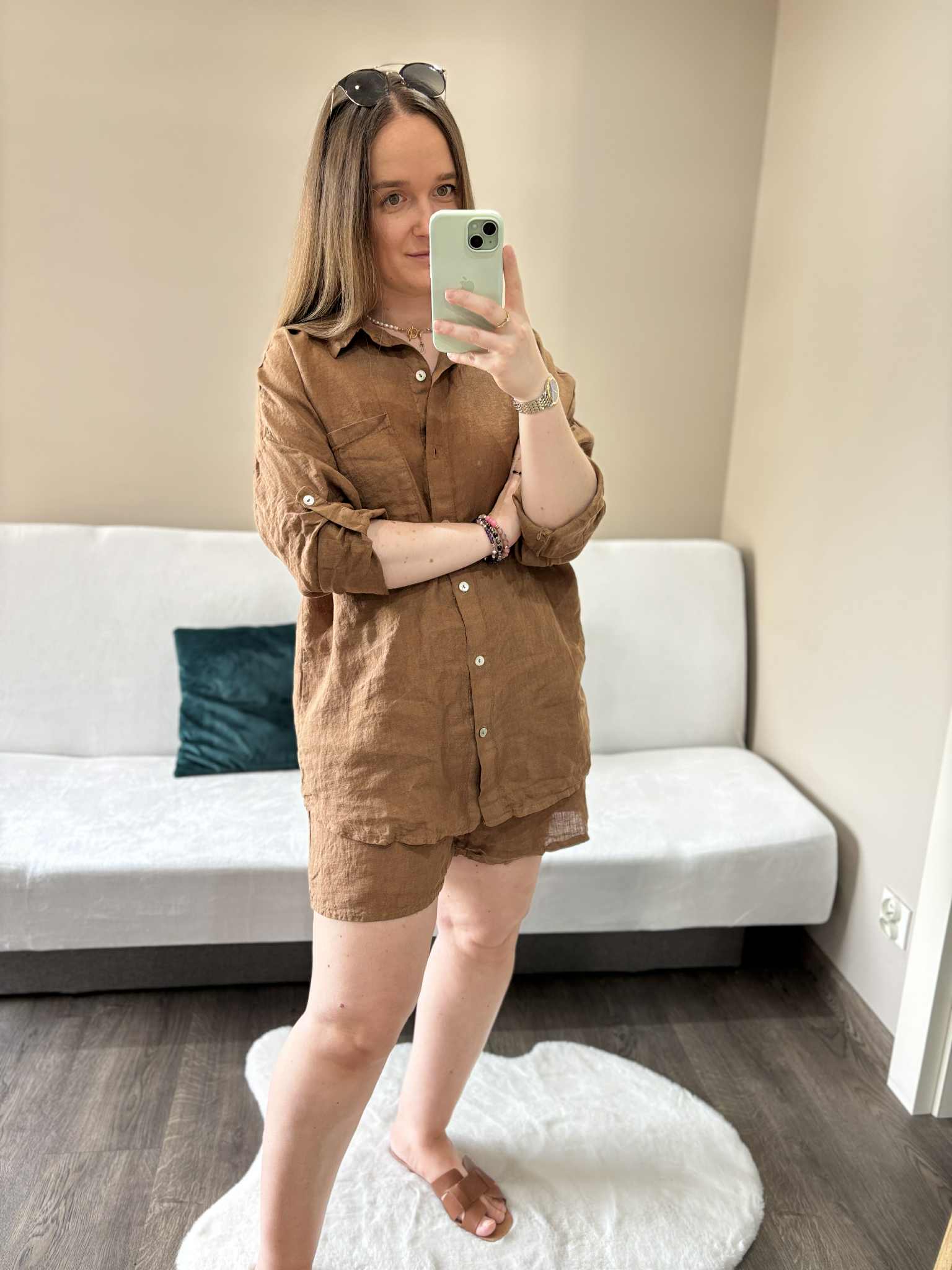 Modny lniany komplet damski w kolorze czekoladowym, który zapewni Ci wygodę i styl w ciepłe dni. Wykonany z przewiewnego, naturalnego materiału, doskonale sprawdzi się na lato, pozwalając skórze oddychać. Koszula zapinana na guziczki, długi rękaw w możliwością podwinięcia dzięki guzikowi na rękawie. Spodenki mają szeroką gumę w pasie i kieszenie.