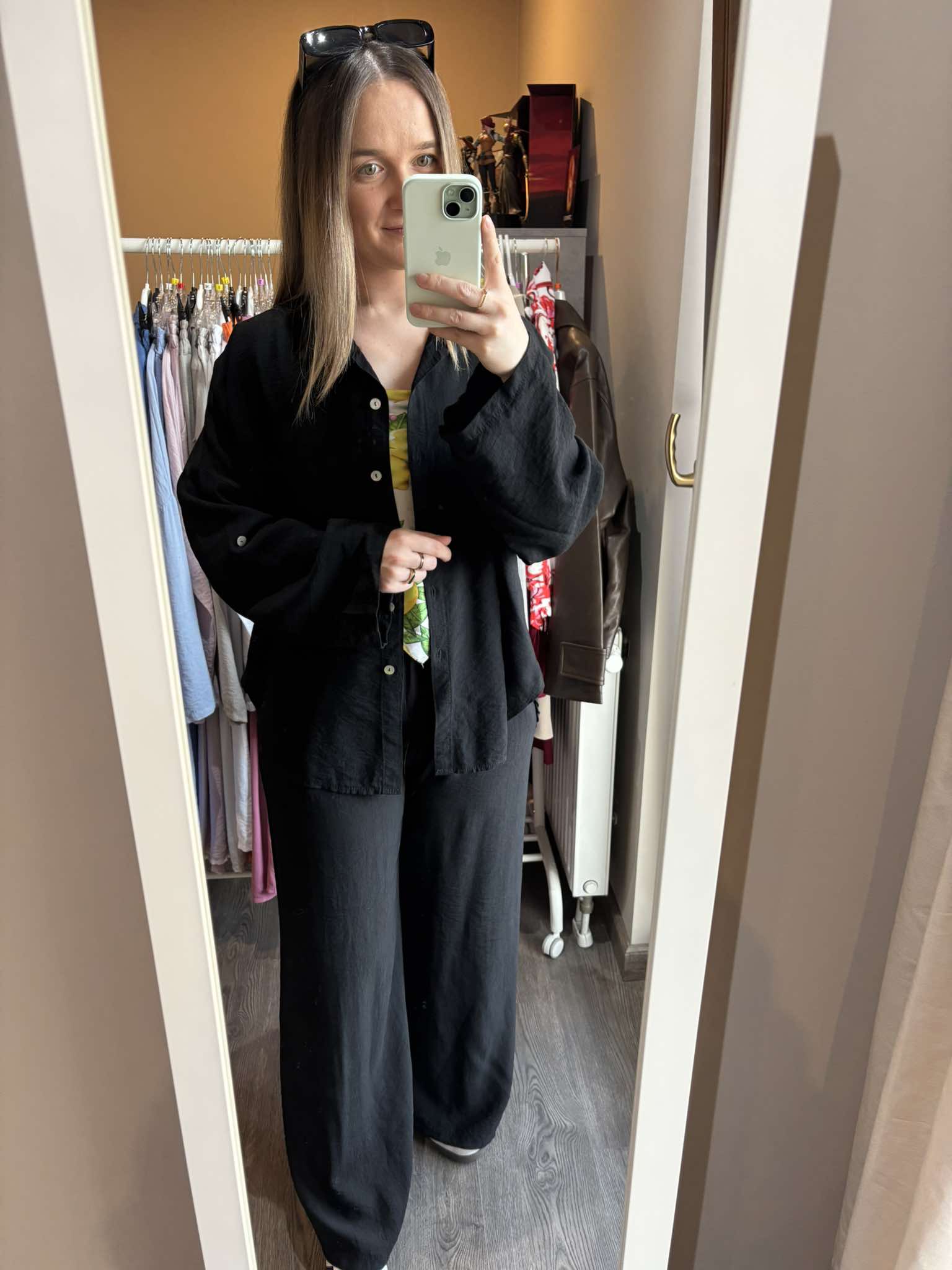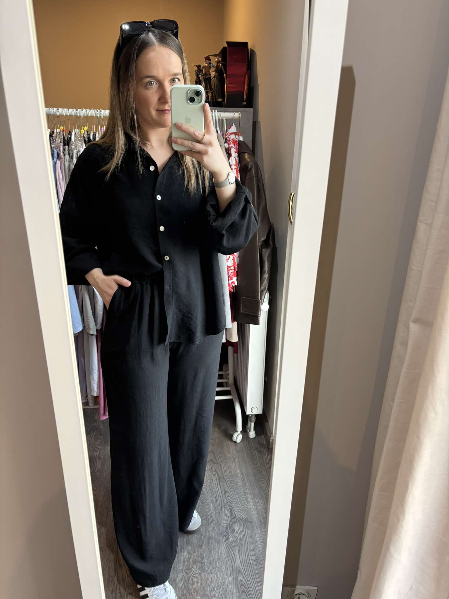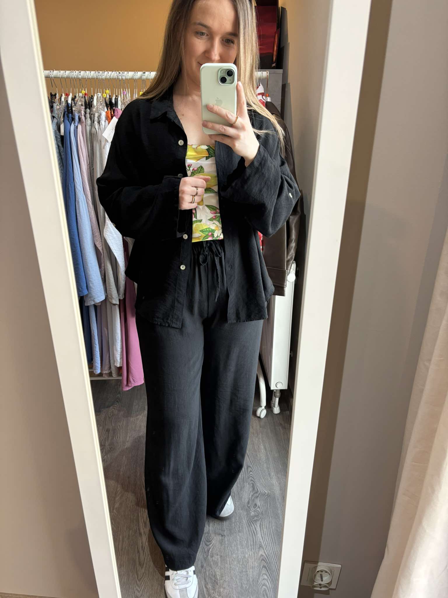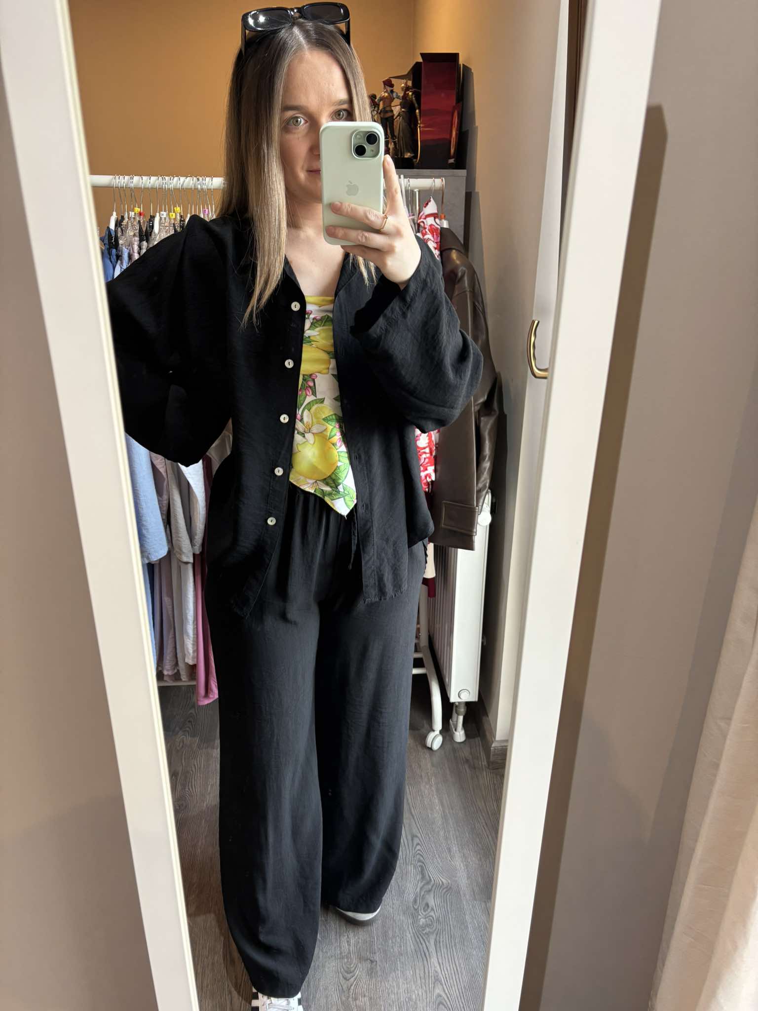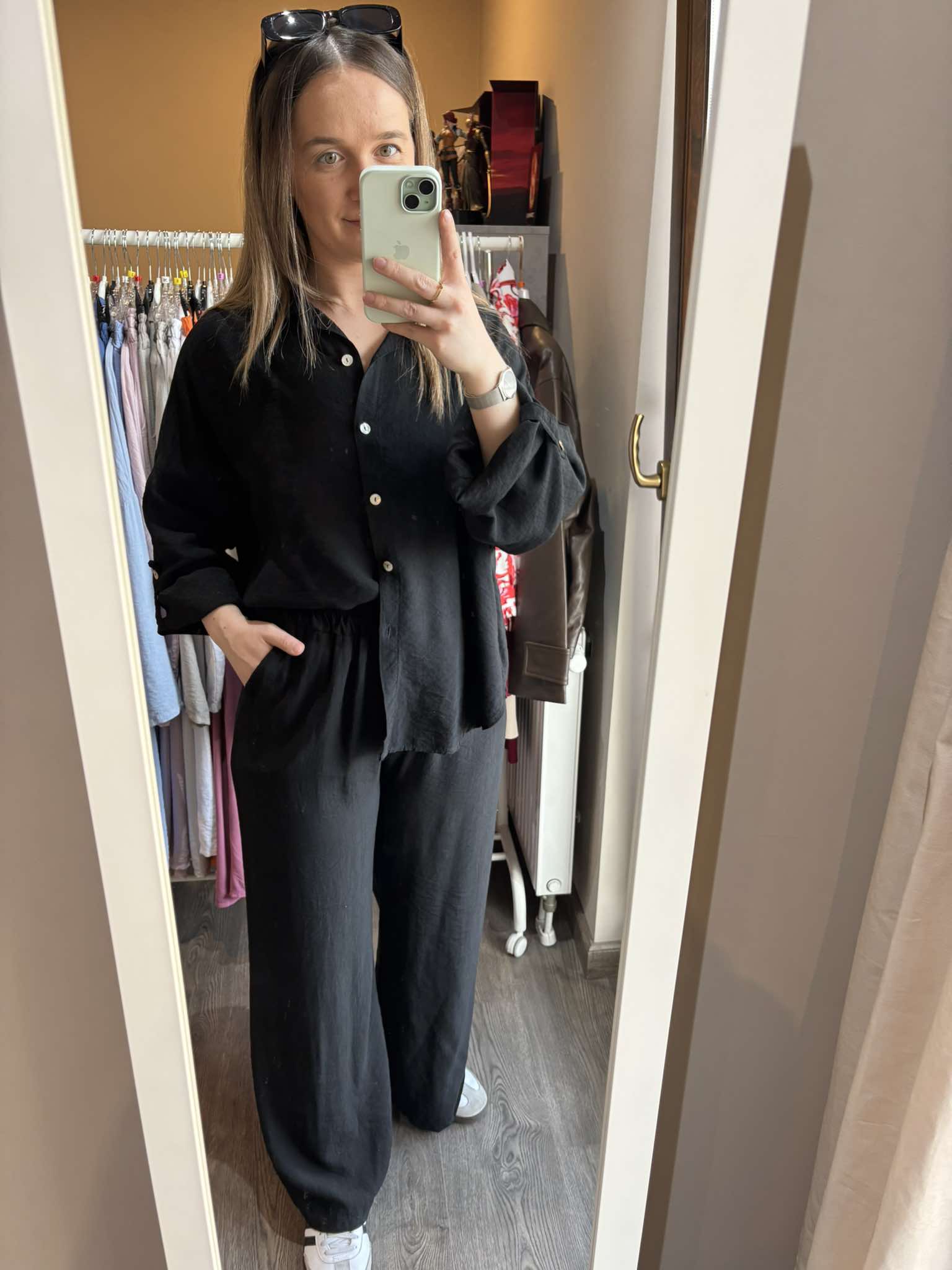 Komplet wiskozowy w kolorze czarnym to luźny komplet idealny na lato, składający się z koszuli i spodni. Spodnie mają prostą nogawkę i są delikatne jak mgiełka. Świetnie sprawdzą się w sportowych stylizacjach, ale dobierając do nich szpilki stworzysz z nimi bardziej elegancką wersję. Spodnie wiskozowe posiadają gumę w pasie, przez co dopasowują się do sylwetki.