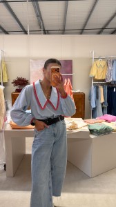 Koszula z kołnierzykiem niebieska Purpura - romantyczna bluzka z kołnierzykiem niebieska z lamówką do wiosennych stylizacji
