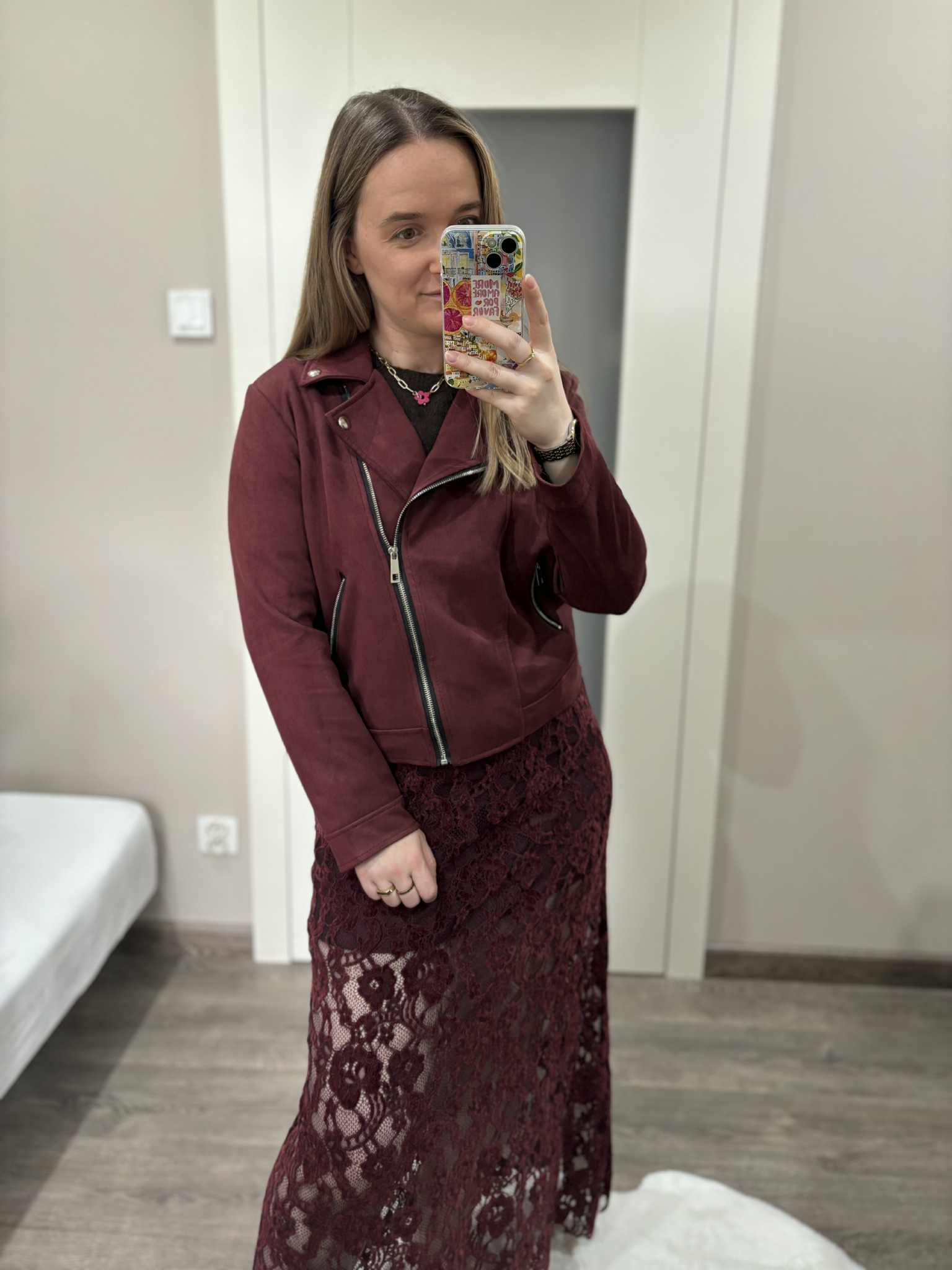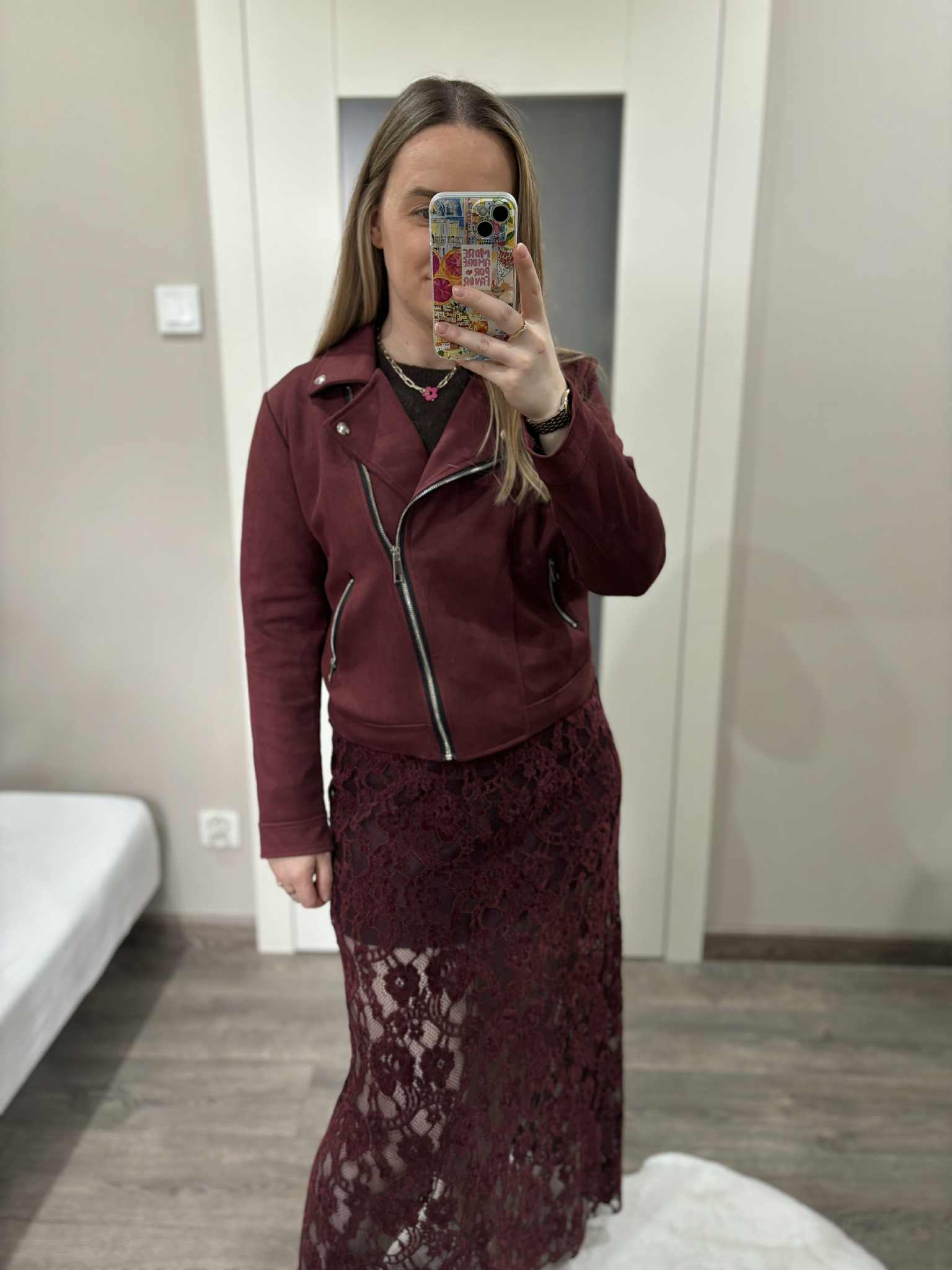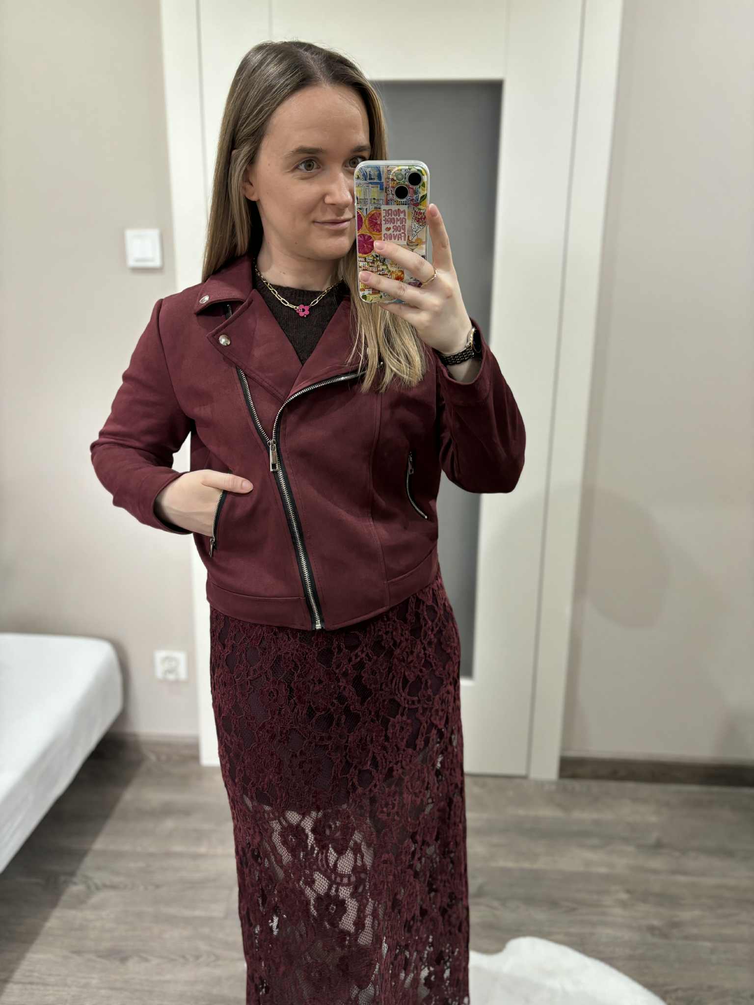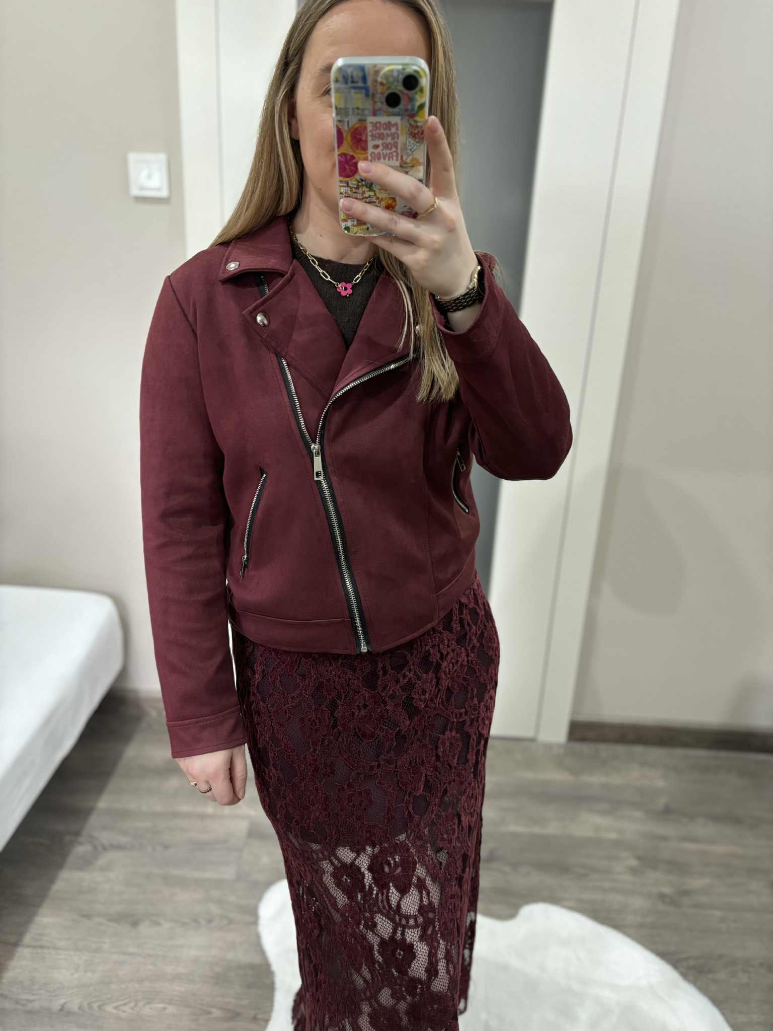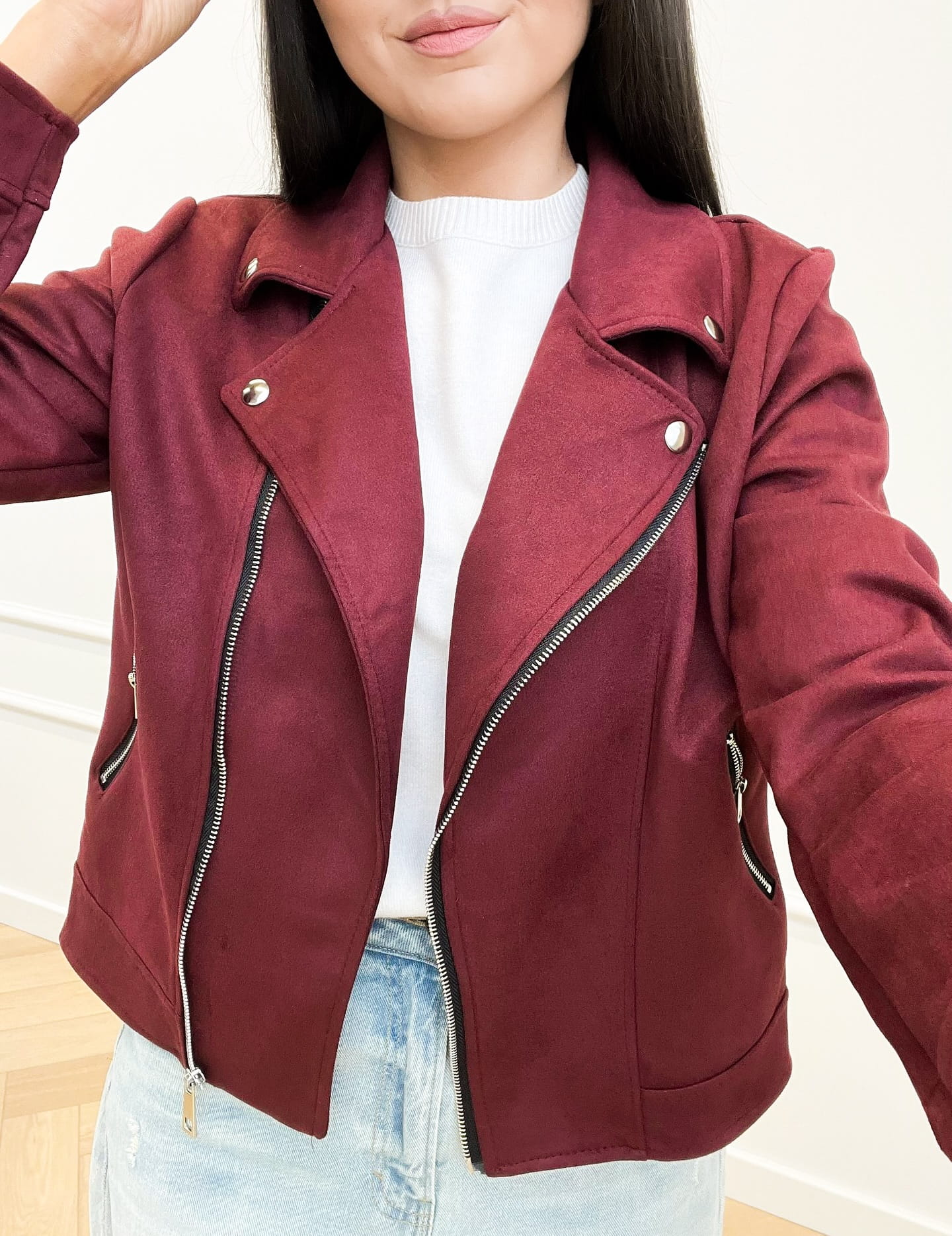 Bordowa kurtka damska zamszowa typu biker – stylowa ramoneska na każdą okazję