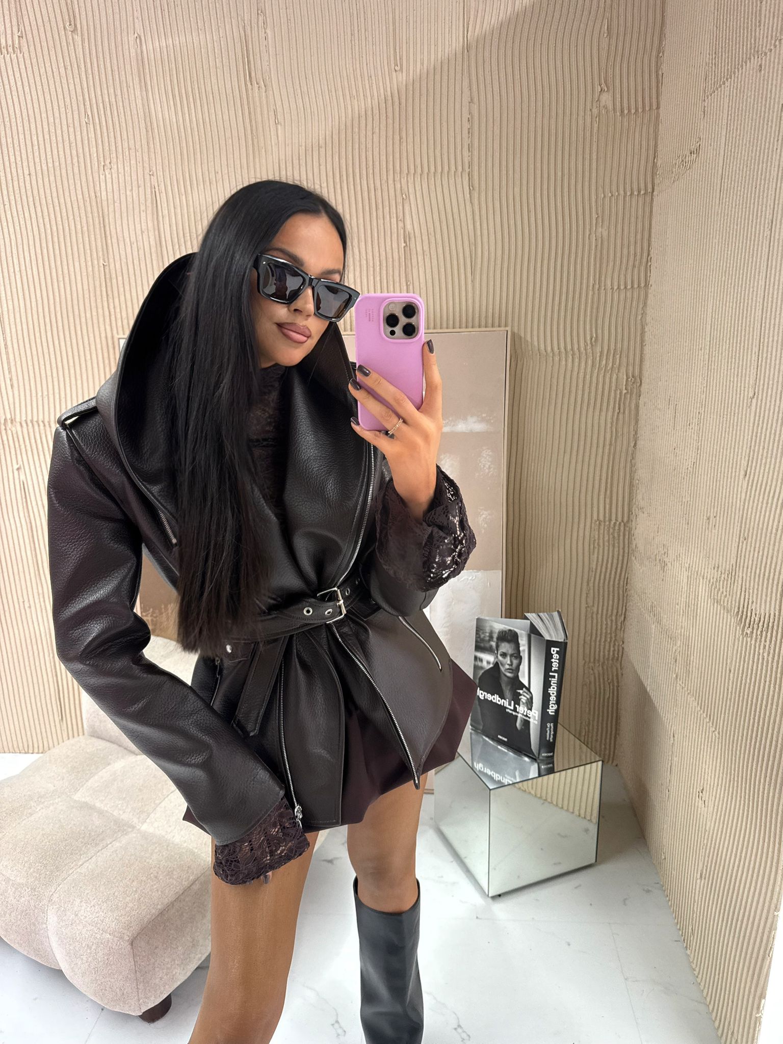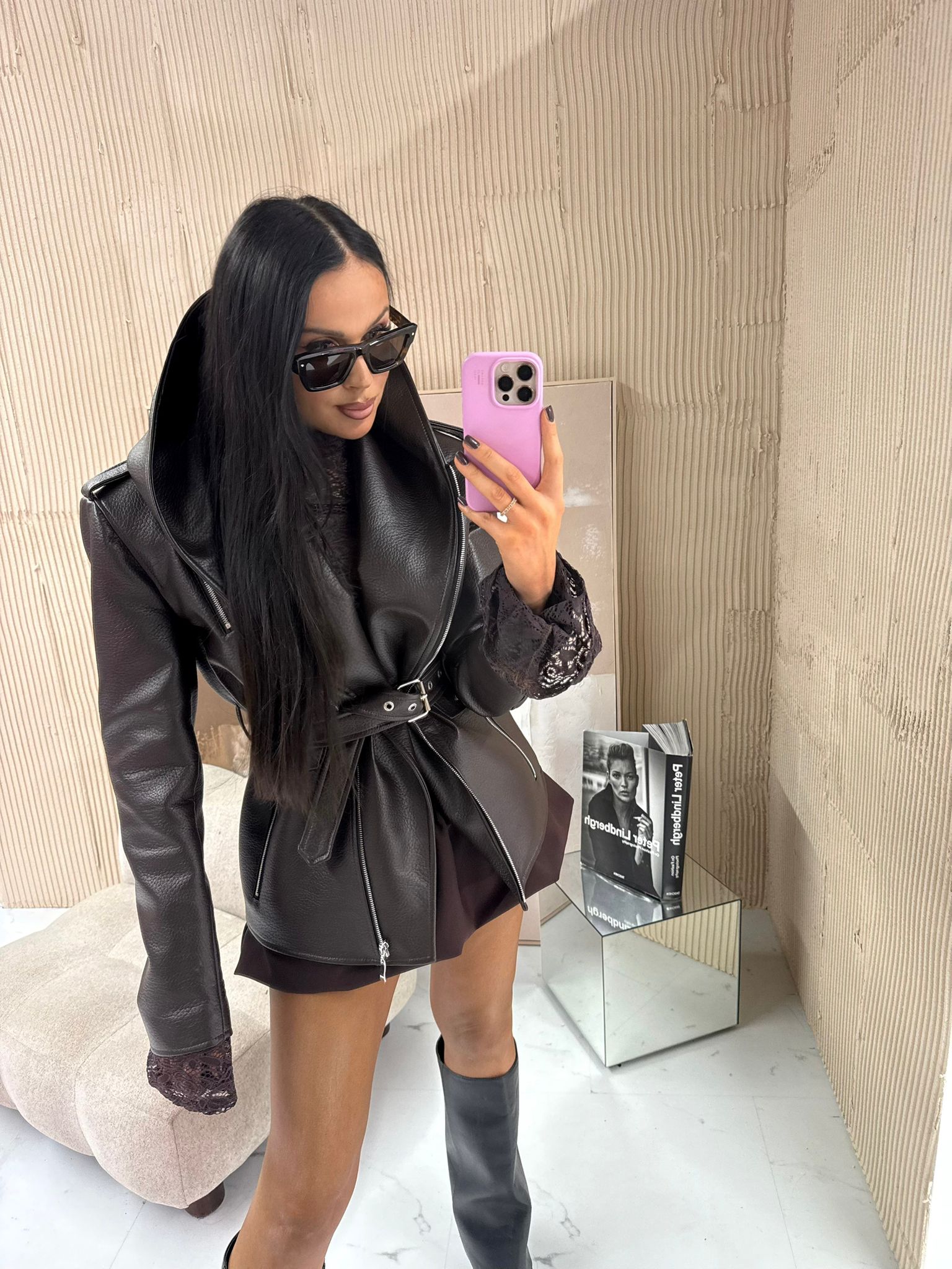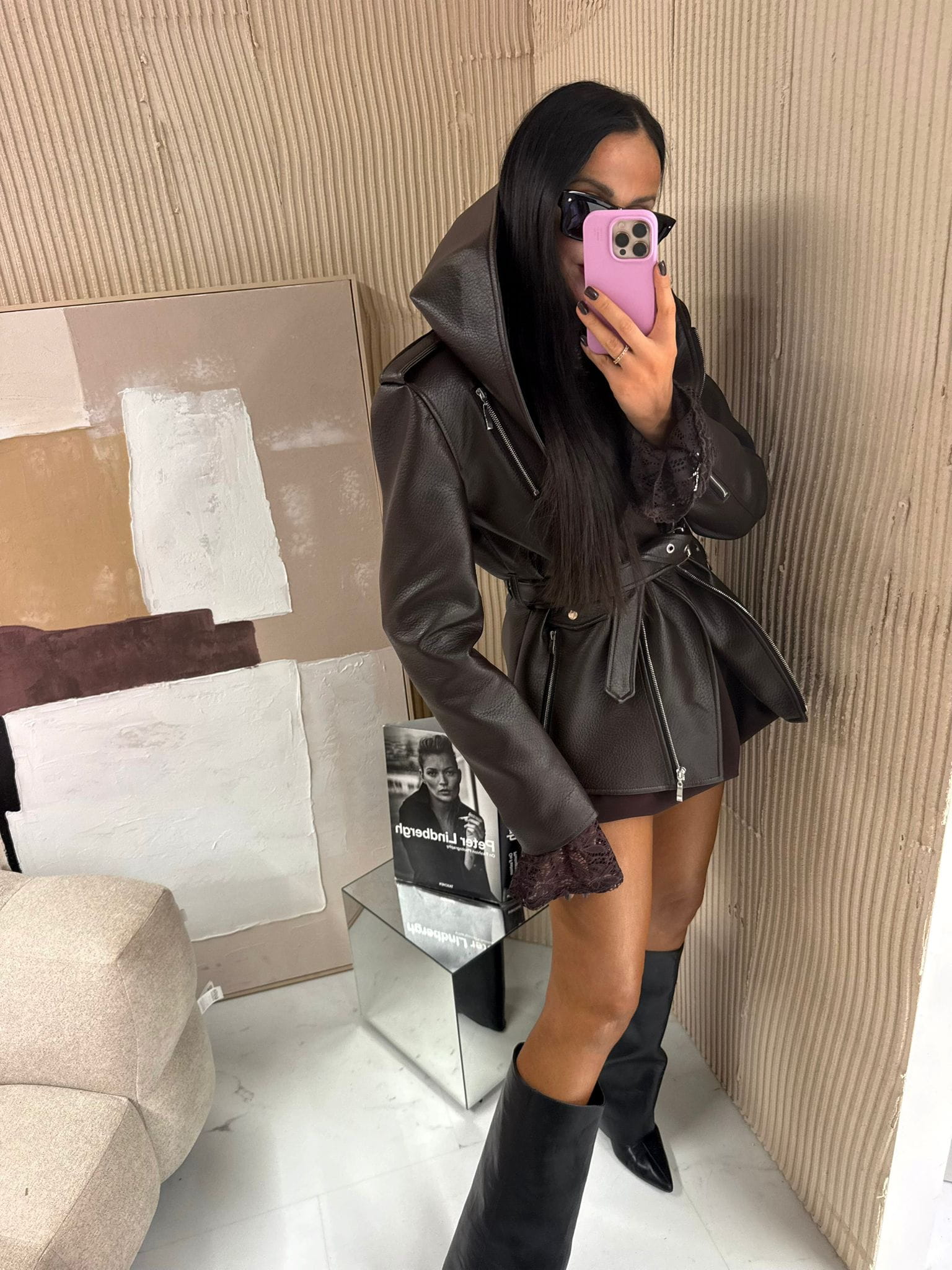 La Milla Kurtka skórzana z kapturem czekoladowa wersja dłuższa