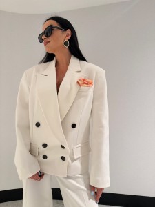 Do marynarki białej możesz dobrać długie eleganckie spodnie La Milla w kant w tym samym odcieniu tworząc garnitur lub eleganckie białe spodenki La Milla motylki.