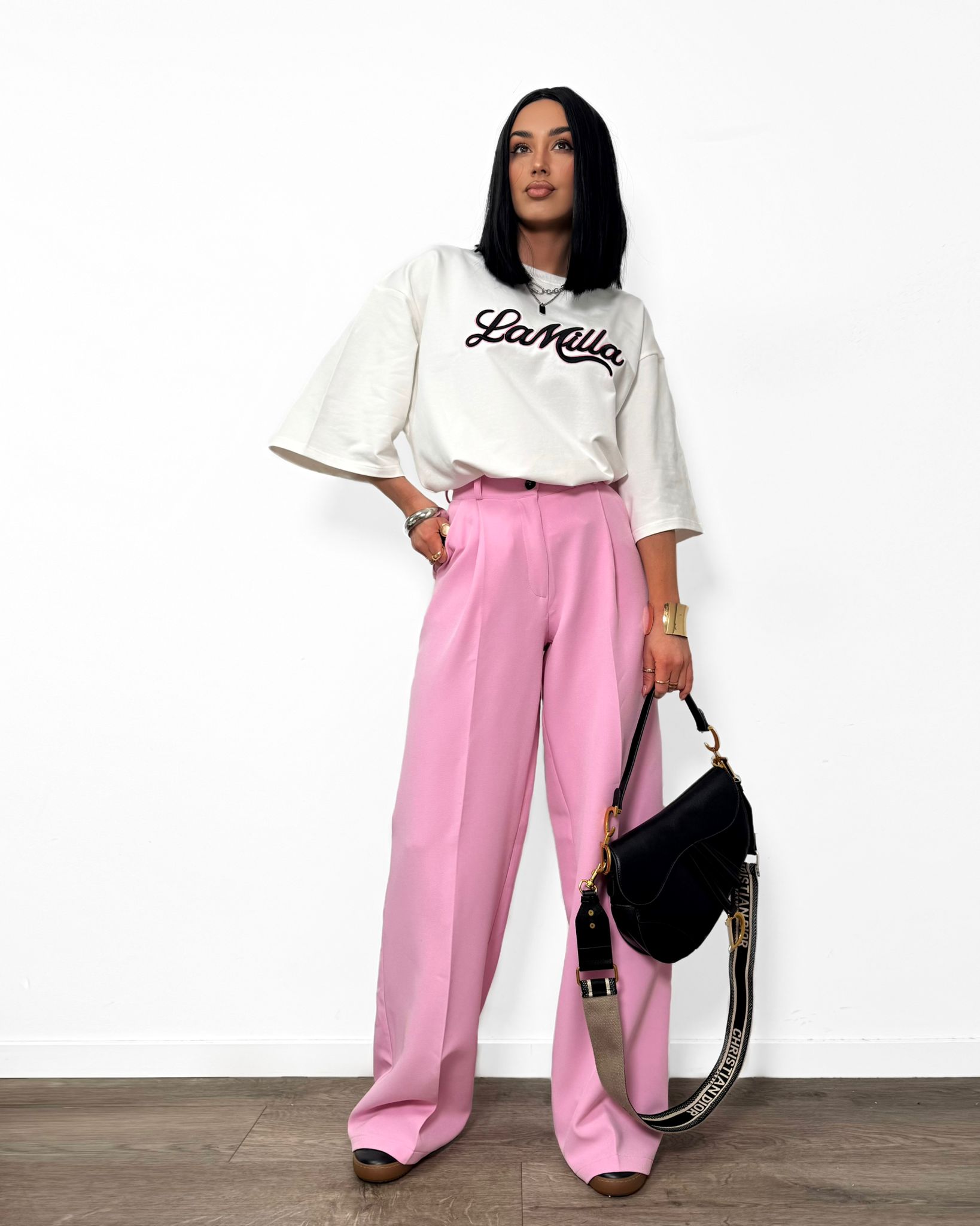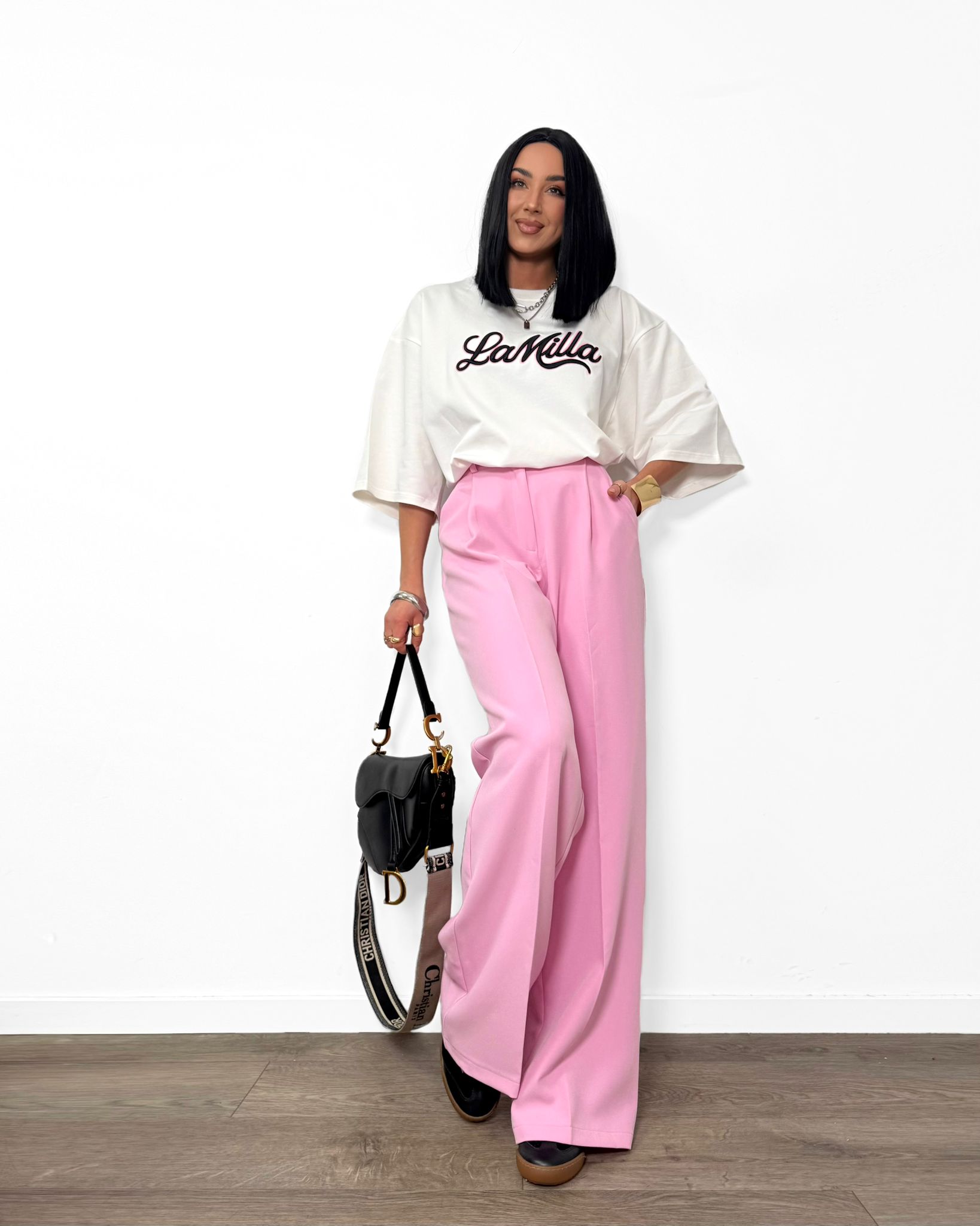 La Milla szerokie spodnie w kant puder róż - komfortowe i eleganckie spodnie La Milla z szeroką prostą nogawką pudrowy róż do marynarki La Milla - garnitur La Milla pudrowy róż