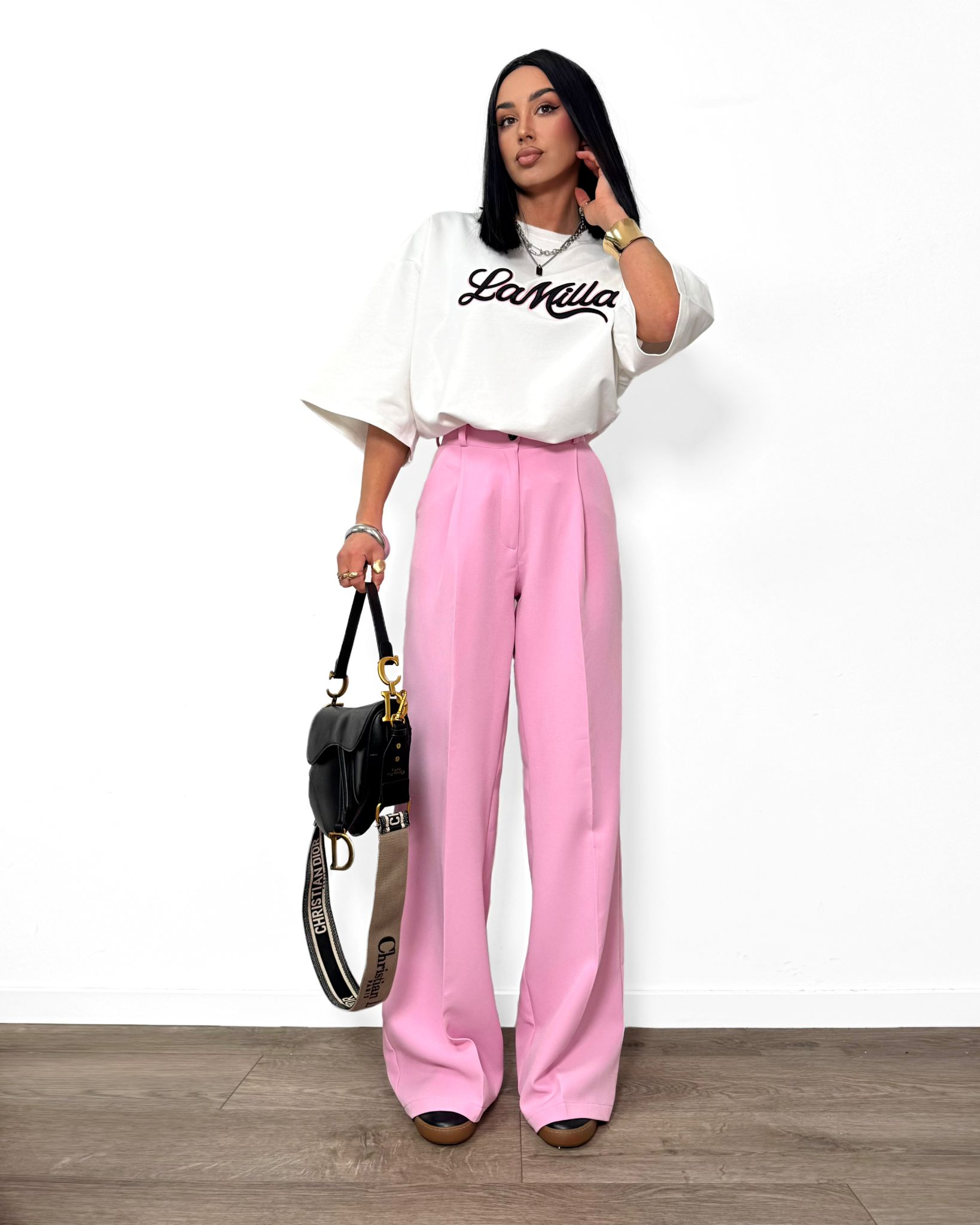 Spodnie La Milla pudrowy róż to najnowsza elegancka propozycja dla Pań ceniących sobie styl i komfort. La Milla spodnie z szeroką, prostą nogawką to idealny wybór na formalne spotkania jak i codzienne wyjścia. Wysoki stan spodni i szerokie nogawki dodają całej stylizacji eleganckiego wyglądu. Spodnie posiadają kieszenie i są zapinane na guzik. Spodnie La Milla różowe możesz połączyć z naszą marynarką La Milla w tym samym kolorze pudrowego różu tworząc stylowy i elegancki błękitny garnitur. Idealna baza szafy kapsułowej, dzięki której stworzysz dziesiątki stylizacji.
