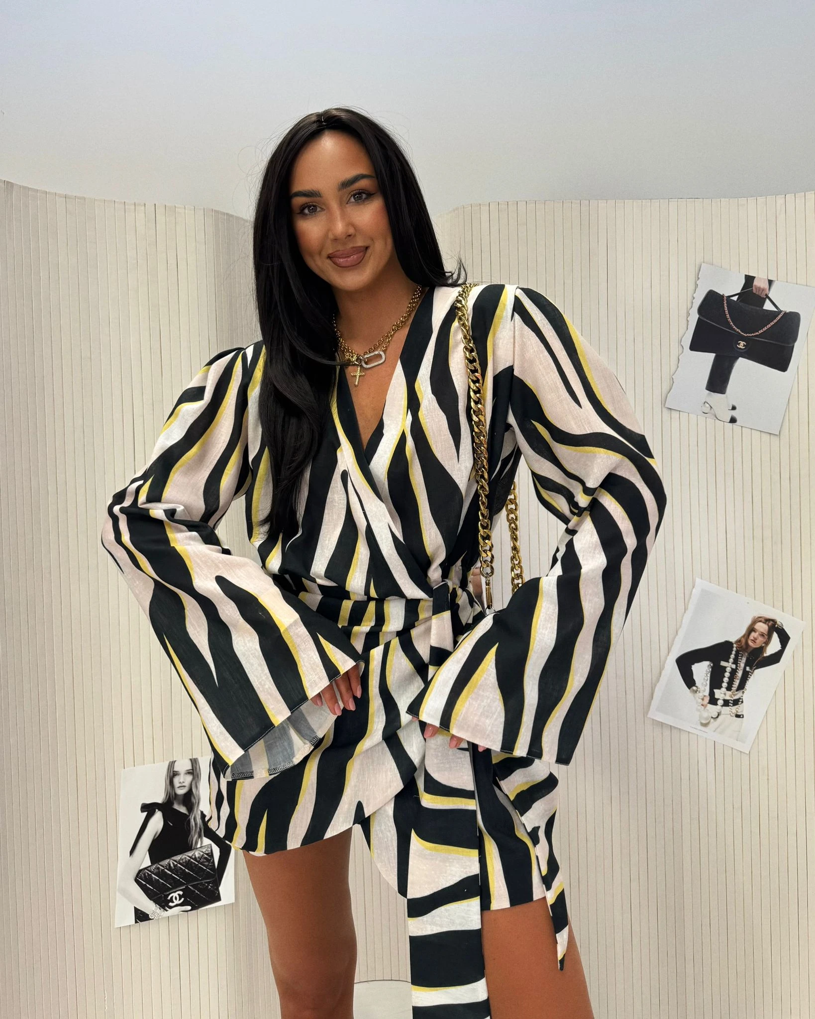 La Milla sukienka lniana kopertowa kimono zebra z żółtym