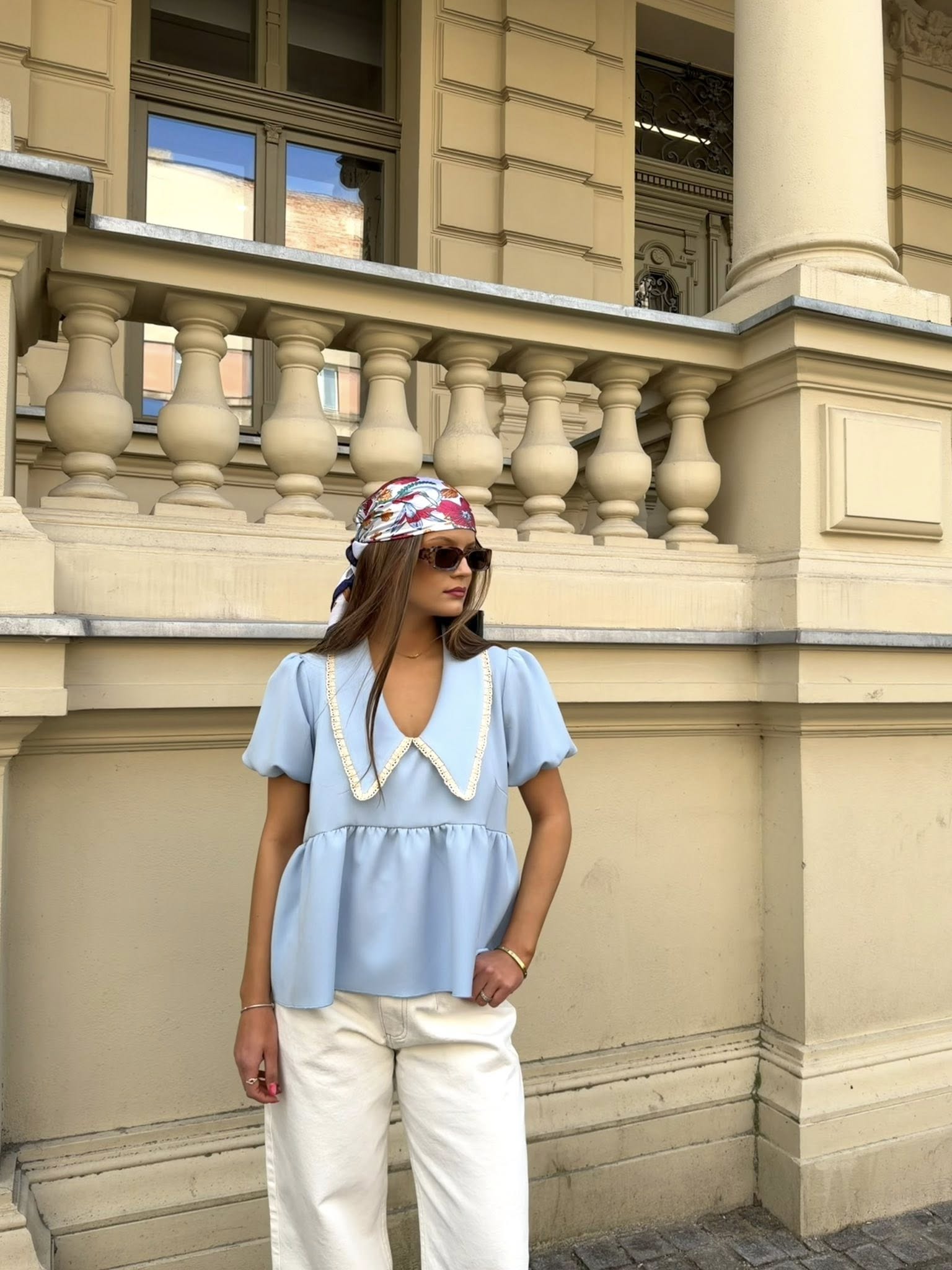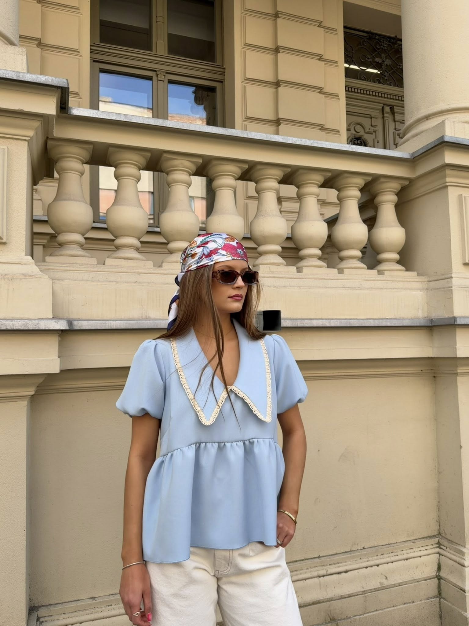 Koszula z kołnierzykiem Purpura błękitna z kontrastową lamówką to idealne połączenie z nutą romantyzmu na wiosnę. Koszula wyróżnia się najmodniejszym w tym sezonie kołnierzykiem wykończonym ażurową koronką. Dzięki tym detalom koszula świetnie sprawdzi się w połączeniu z naszymi jeansami Purpura lub spodniami z falbaną. Delikatnie bufiaste rękawy długości 3/4 zakończone ściągaczem i falbaną dodają koszuli lekkości. Koszula doskonale sprawdzi się w letnio-wiosennych stylizacjach. Idealny wybór dla kobiet ceniących wyraziste detale i ponadczasowy styl.