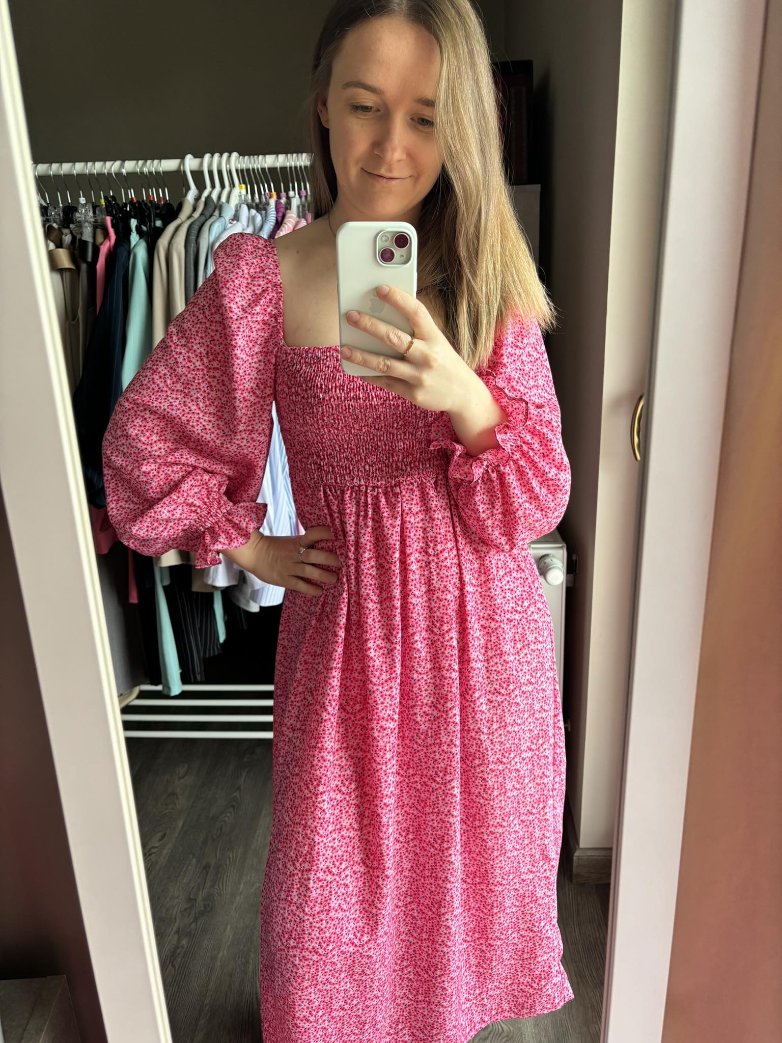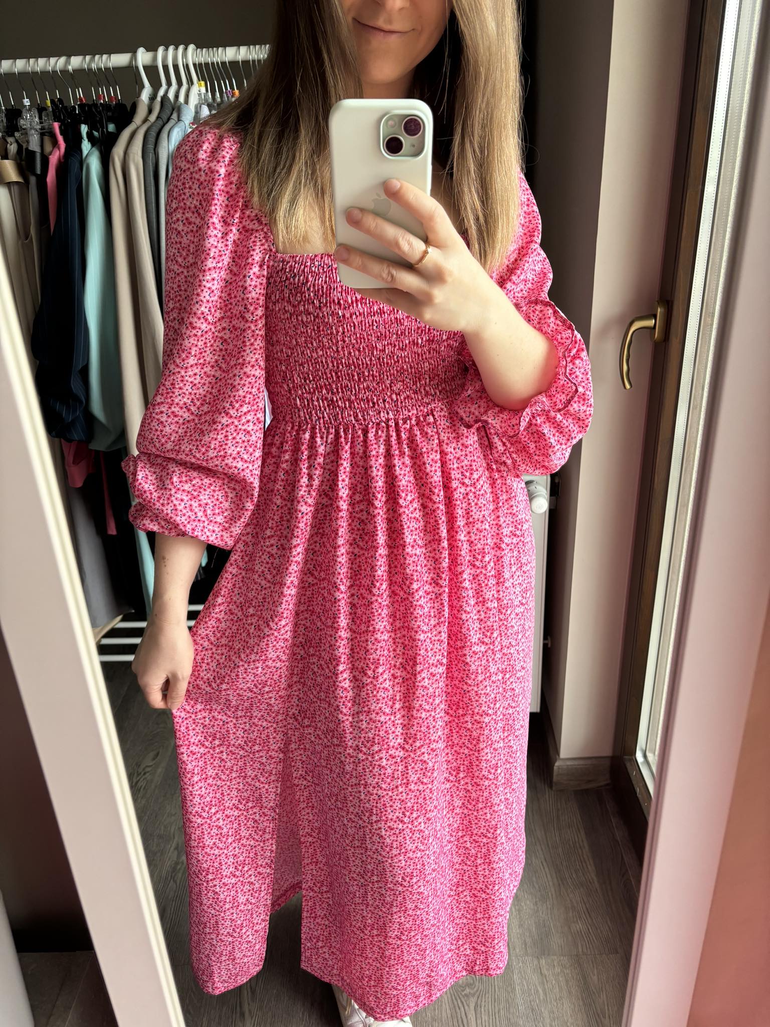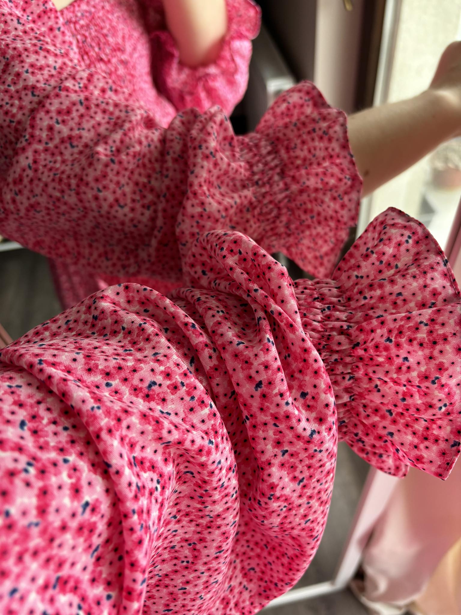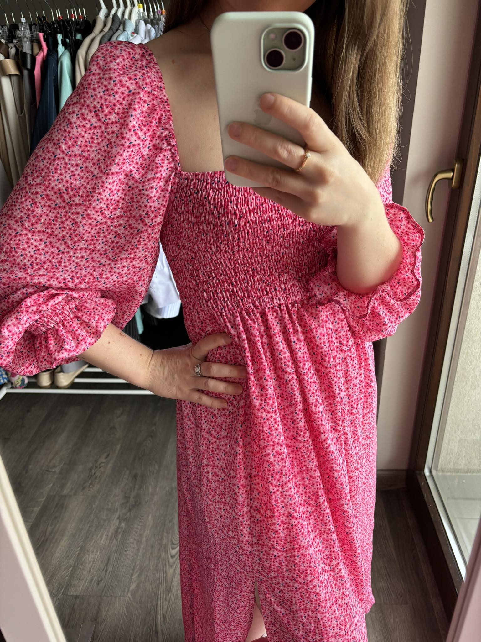 Sukienka hiszpanka midi w kolorze różowym w delikatne kwiatki z rozcięciem to elegancki i romantyczny wybór na różne okazje. Gumonici w biuście dodają wygody i dopasowania, podkreślając jednocześnie sylwetkę. Sukienka midi jest kobieca, delikatna i idealna na letnie dni lub specjalne wydarzenia.