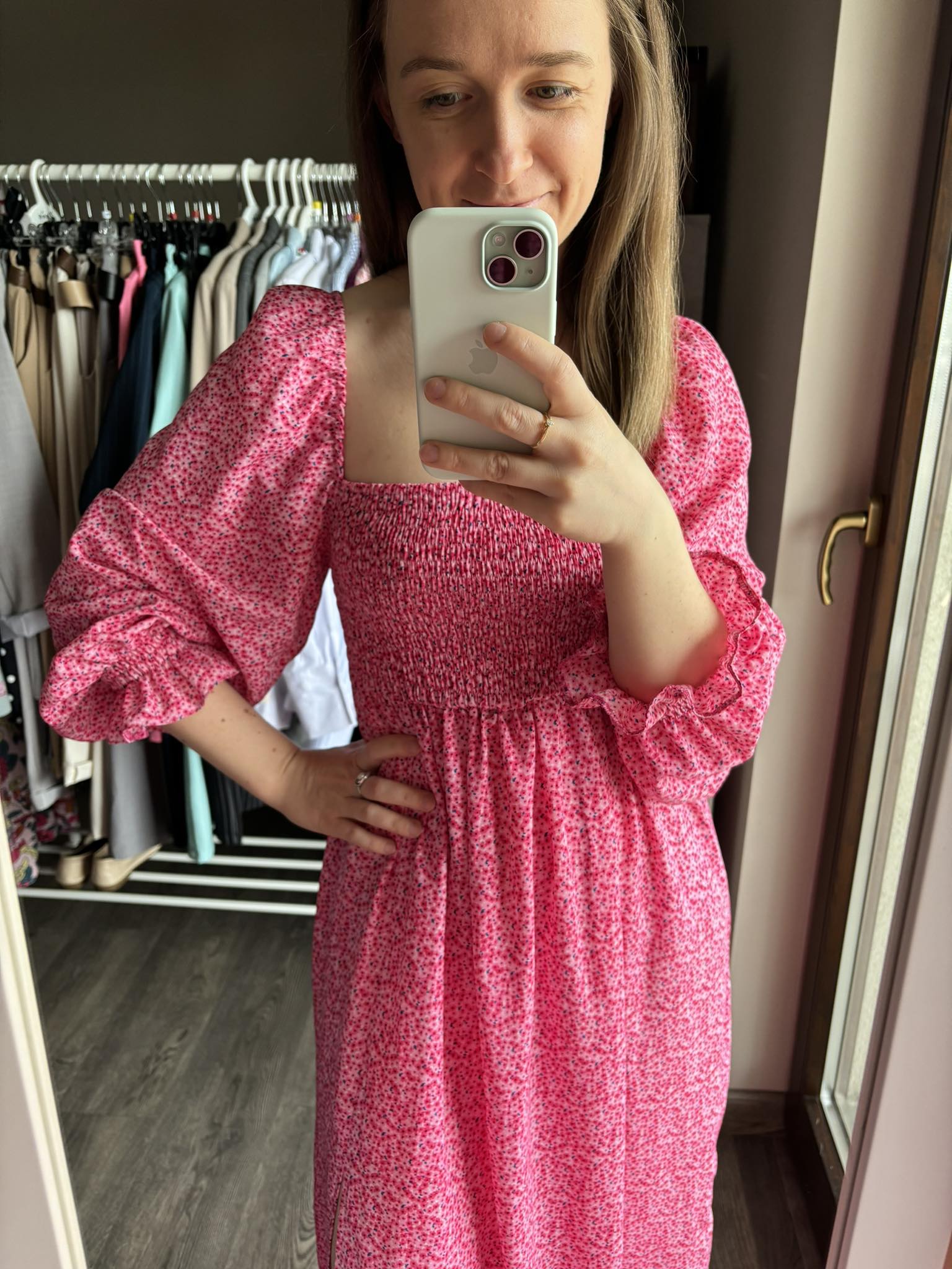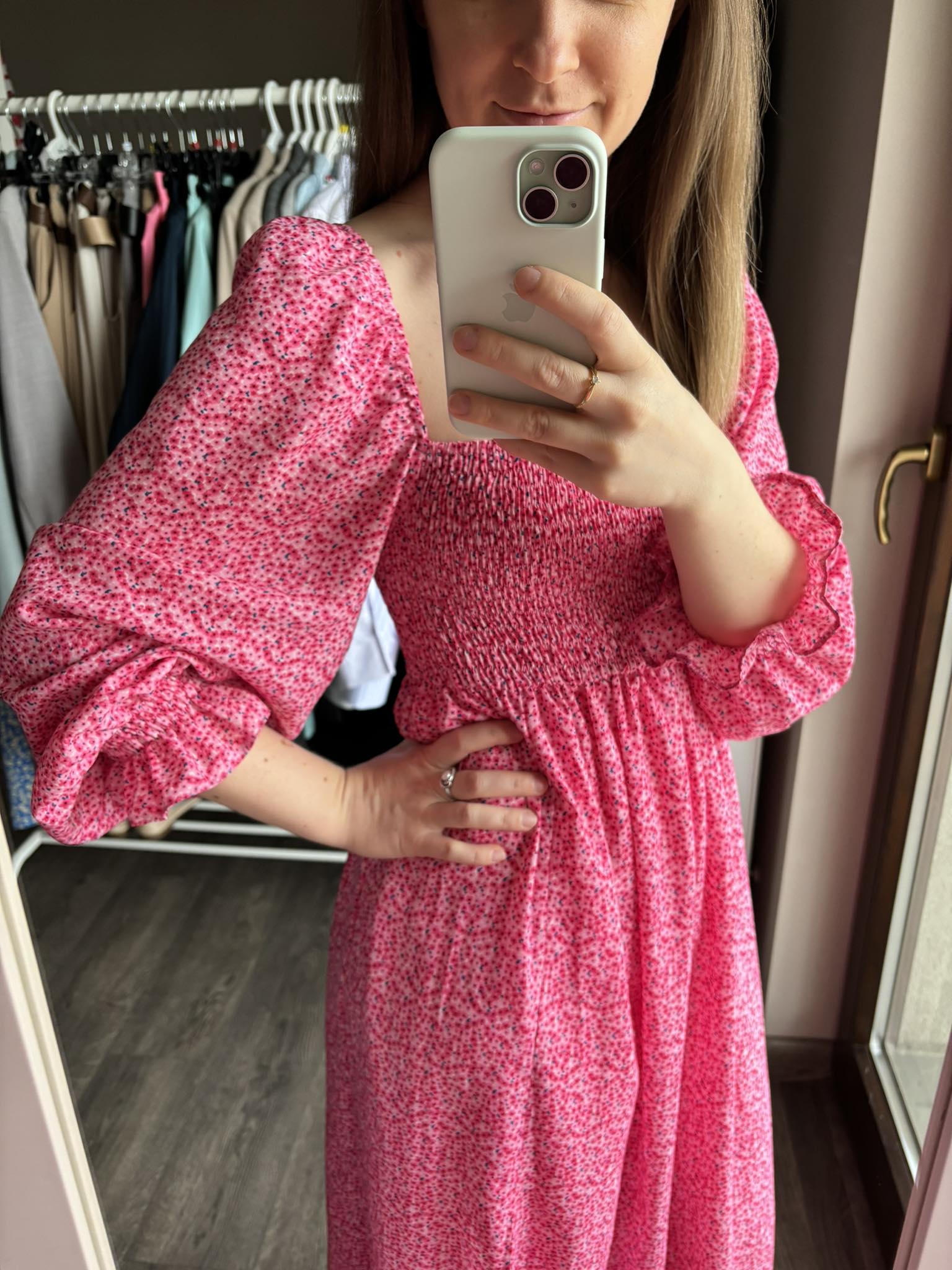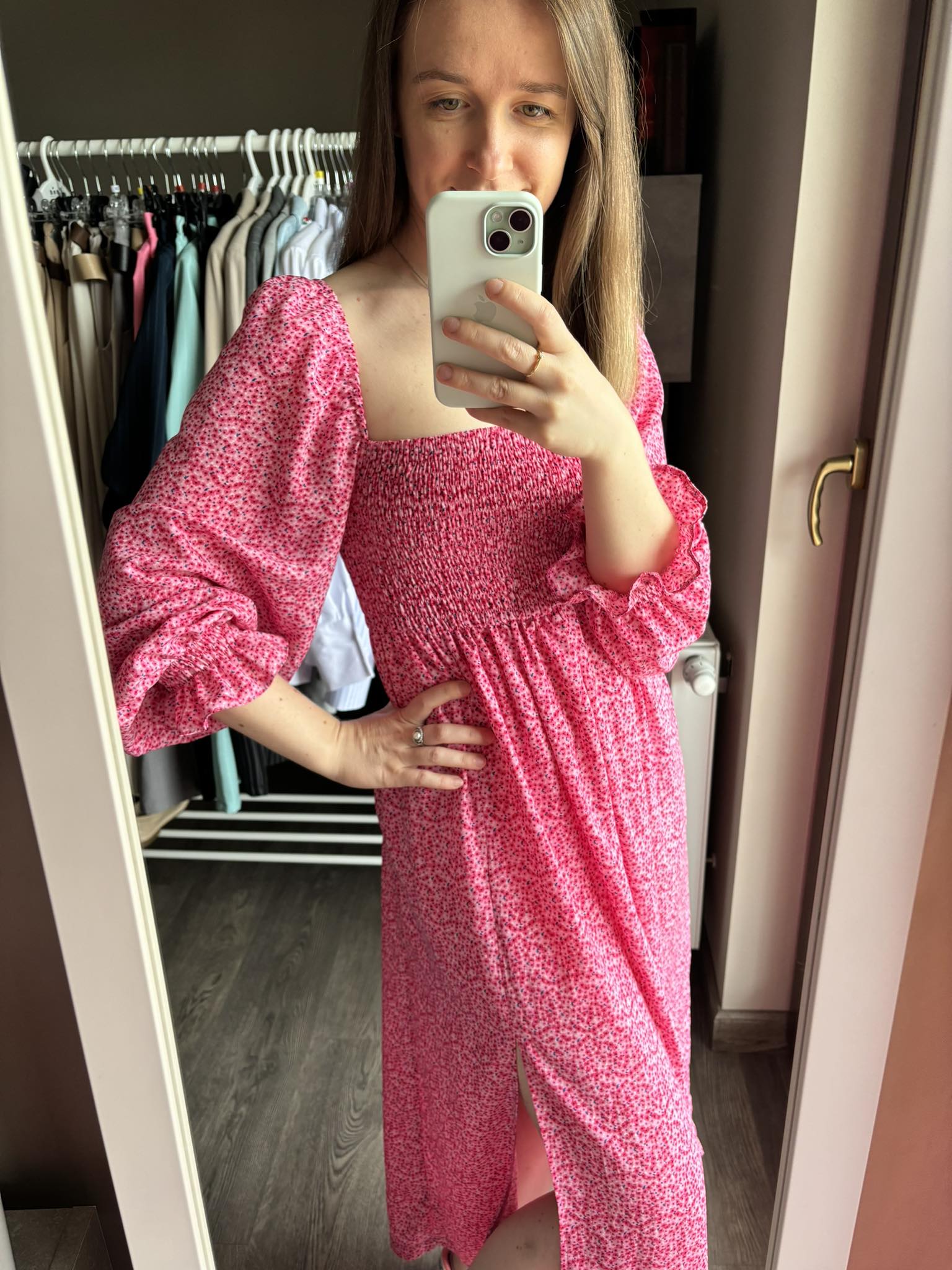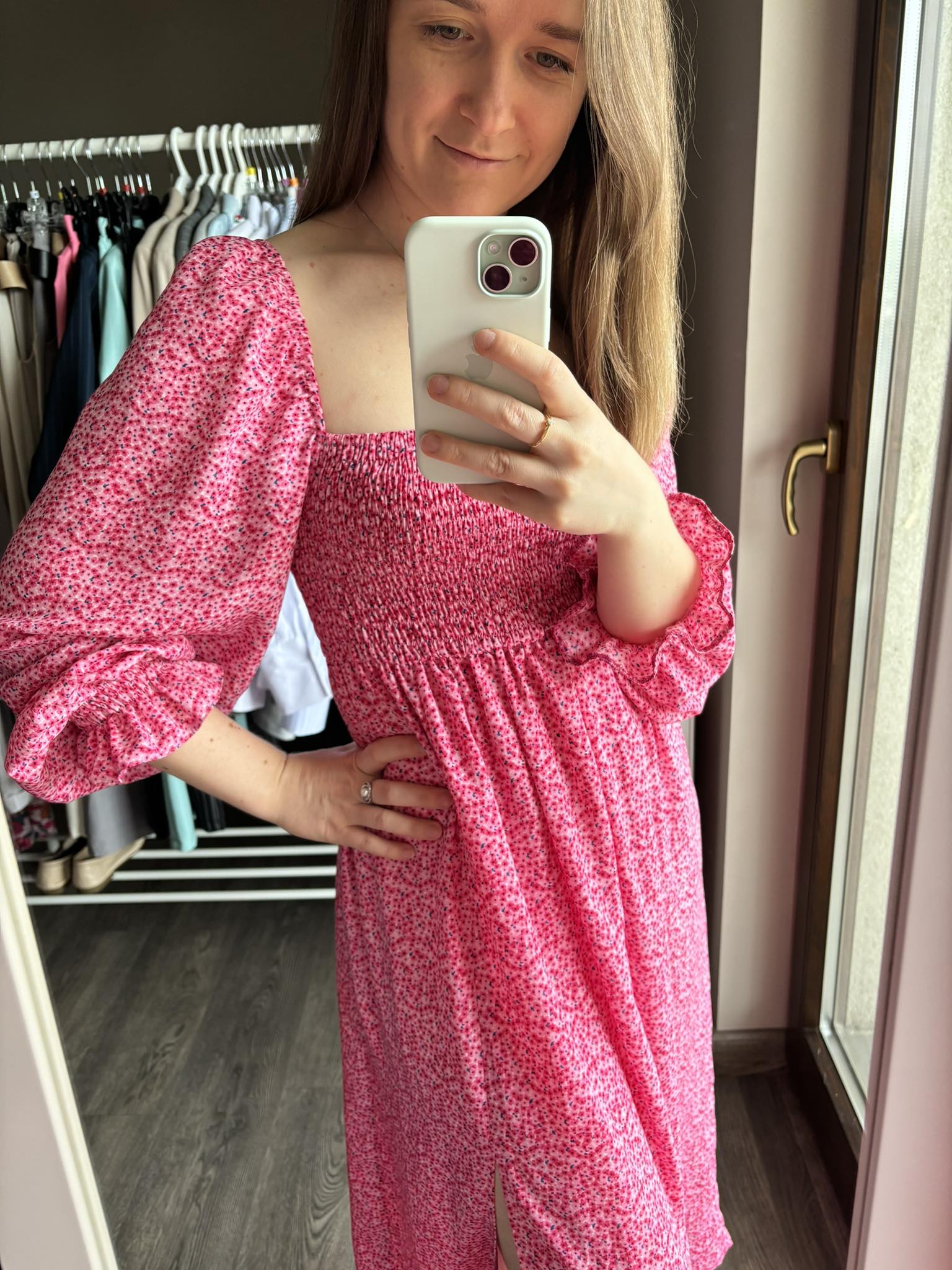 Sukienka hiszpanka midi w kolorze różowym w delikatne kwiatki z rozcięciem to elegancki i romantyczny wybór na różne okazje. Gumonici w biuście dodają wygody i dopasowania, podkreślając jednocześnie sylwetkę. Sukienka midi jest kobieca, delikatna i idealna na letnie dni lub specjalne wydarzenia.