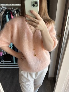 Sweter kid moher z rękawem 3/4 w przepięknym brzoskwiniowym kolorze. Sweter moherowy jest miękki, ciepły i delikatny dla skóry (nie gryzie). Dekolt w kształcie litery V. Moherowy sweter to idealny wybór dla miłośniczek stylu i wygody każdego dnia.
