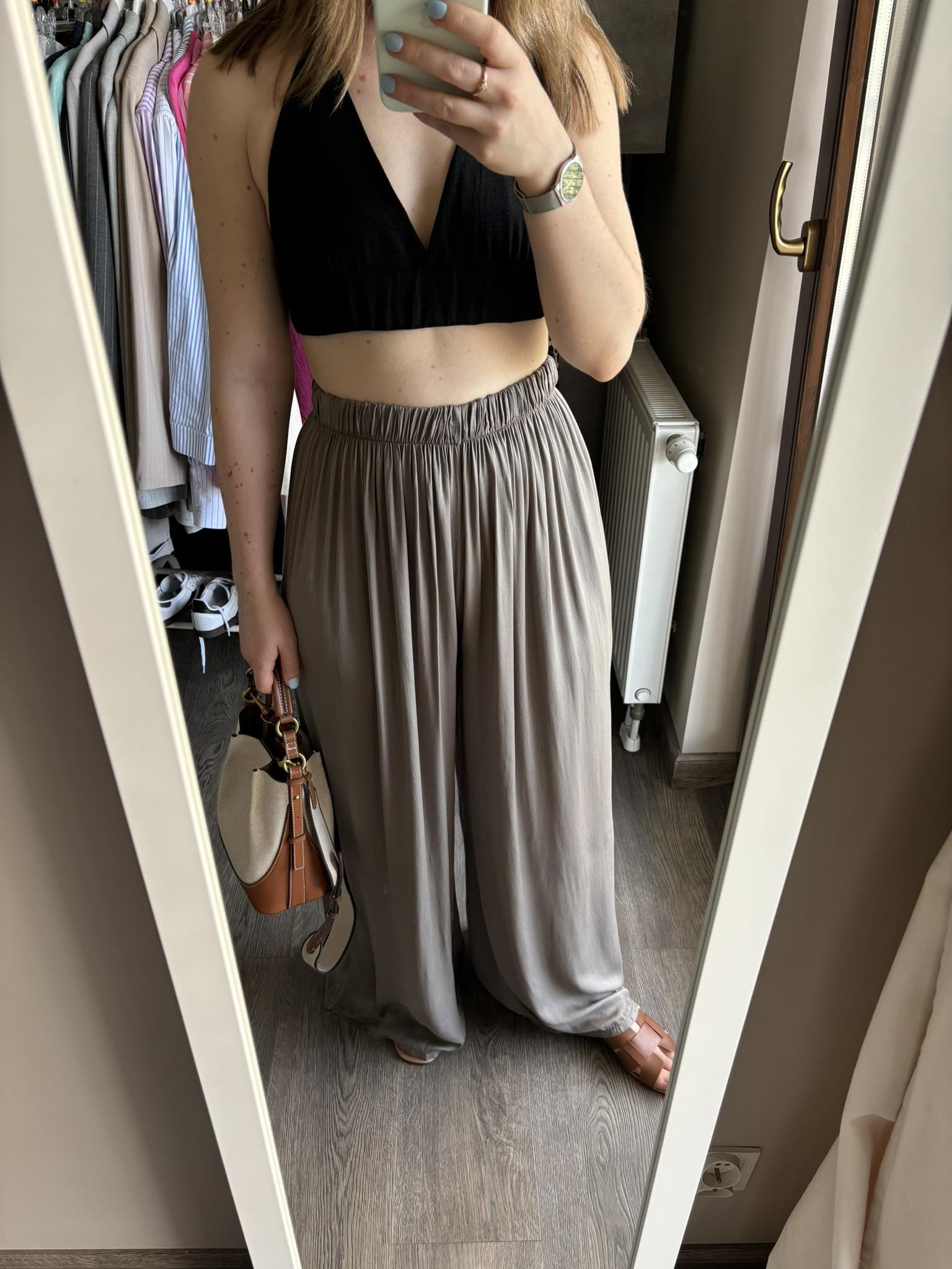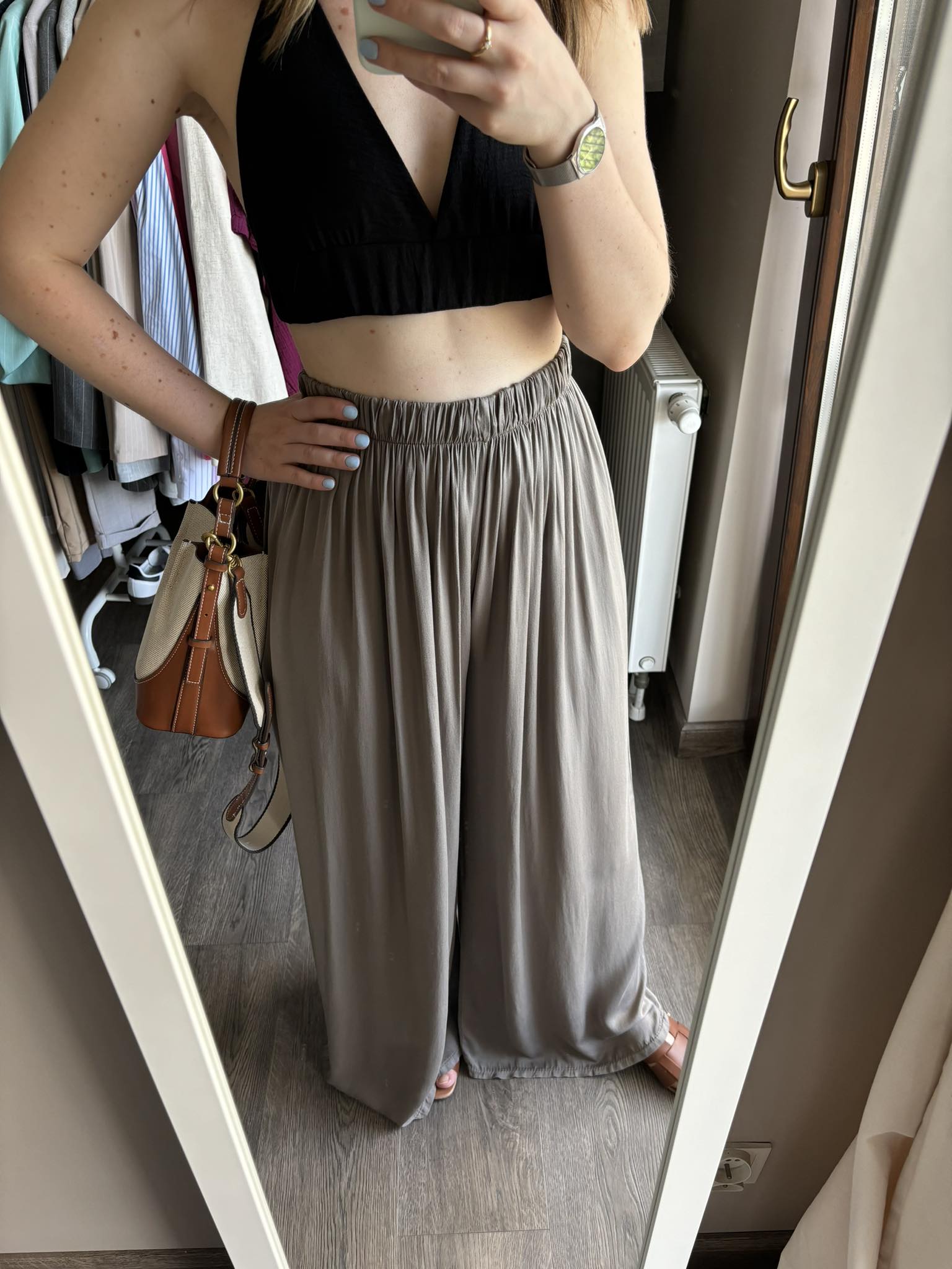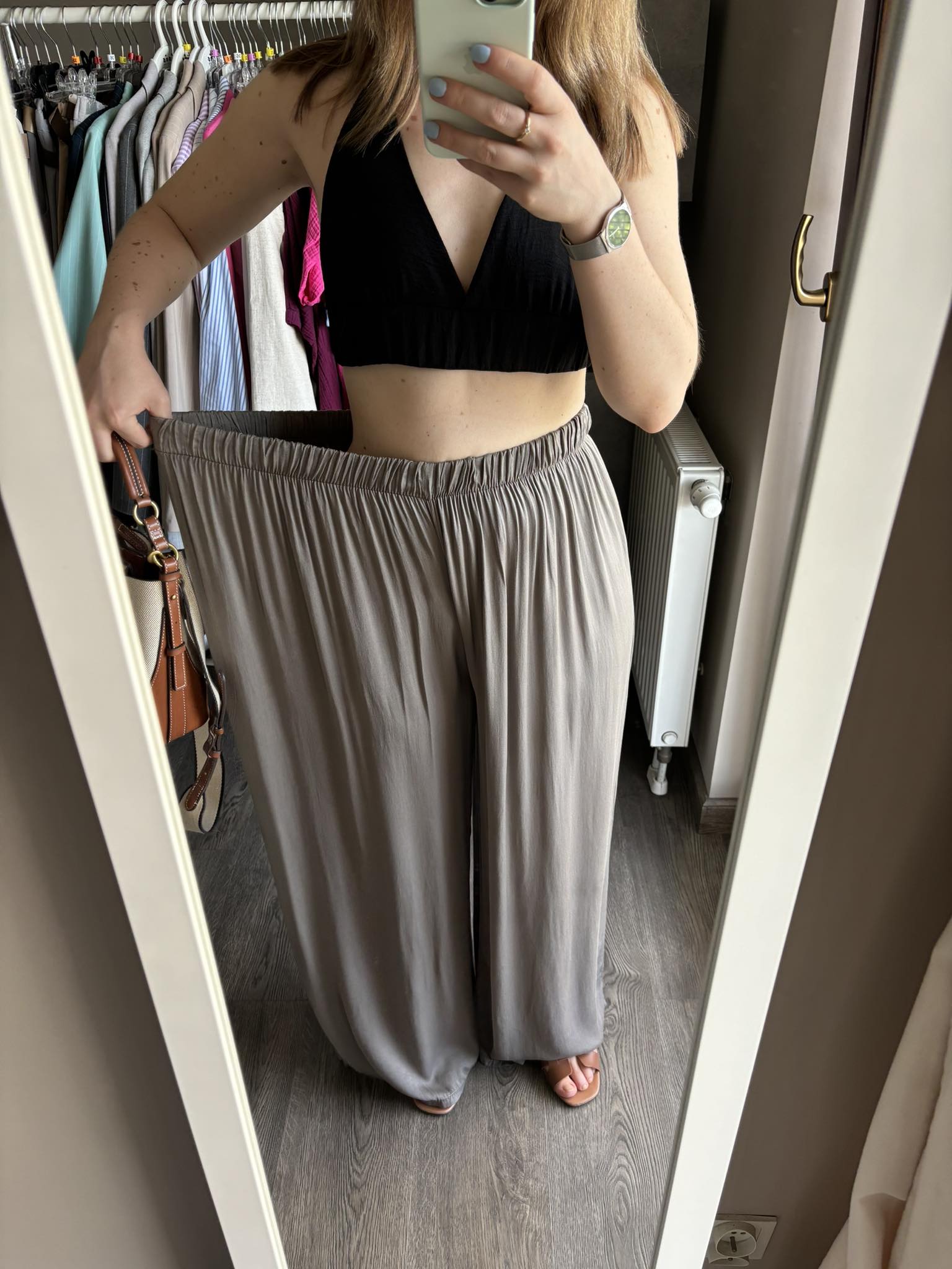Dzięki szerokim, lejącym nogawkom spodnie pięknie układają się na sylwetce, dodając jej lekkości i szyku. Gumka w talii gwarantuje wygodne dopasowanie do różnych typów figury, dlatego model ten pasuje na rozmiary od XS do XXL. Neutralny kolor taupe, łączący odcienie beżu i szarości, to ponadczasowy wybór, który świetnie komponuje się zarówno z jasnymi, jak i ciemniejszymi dodatkami.