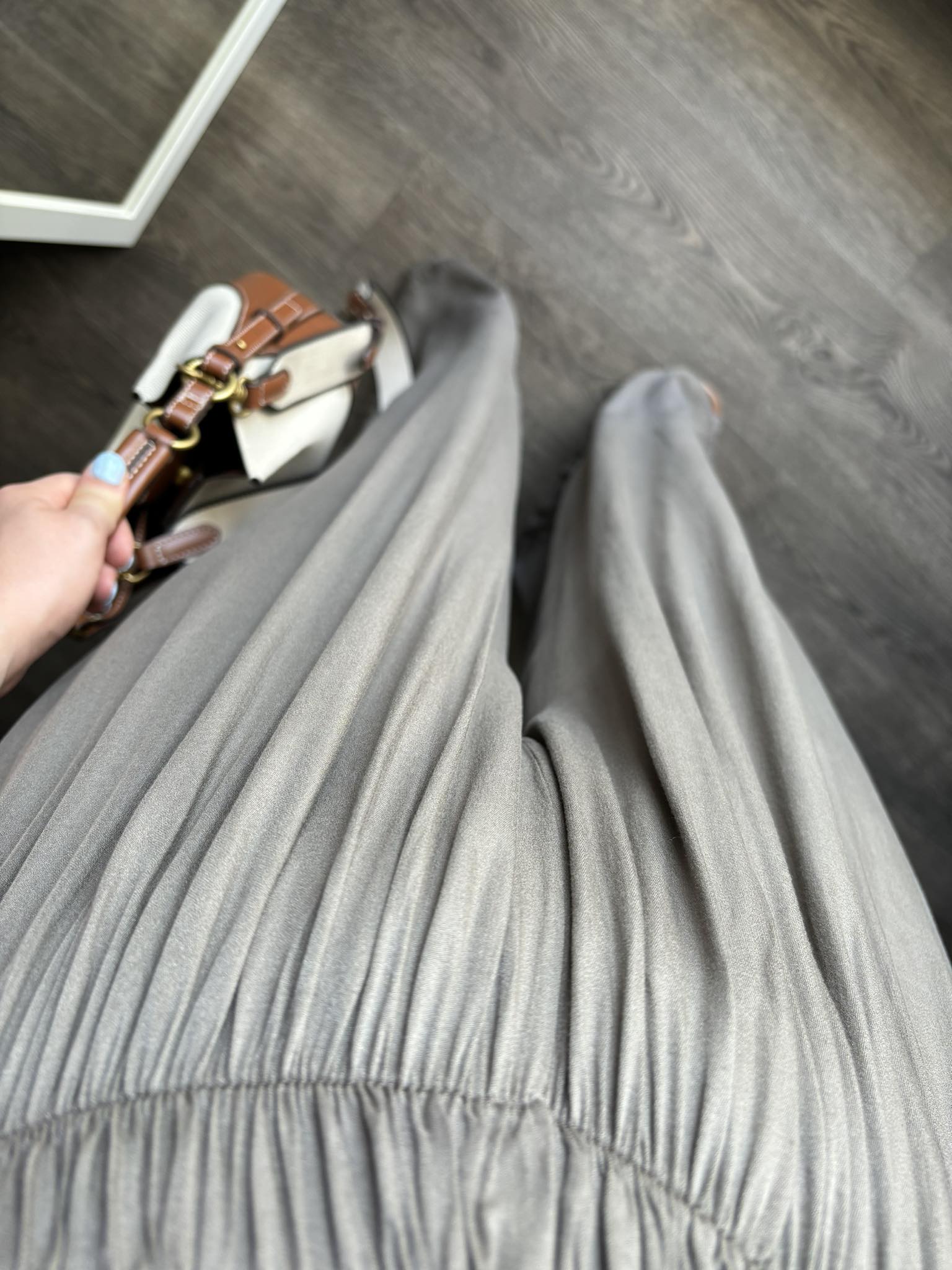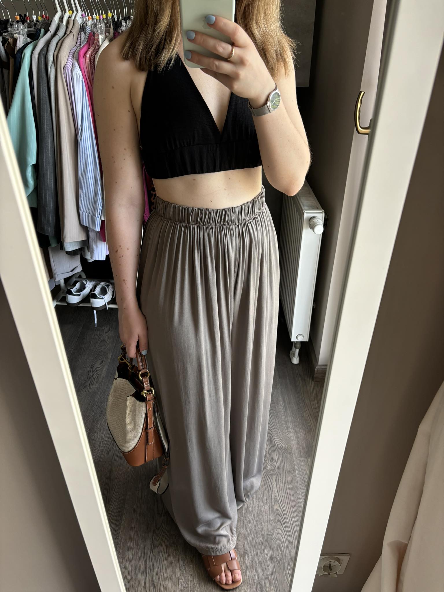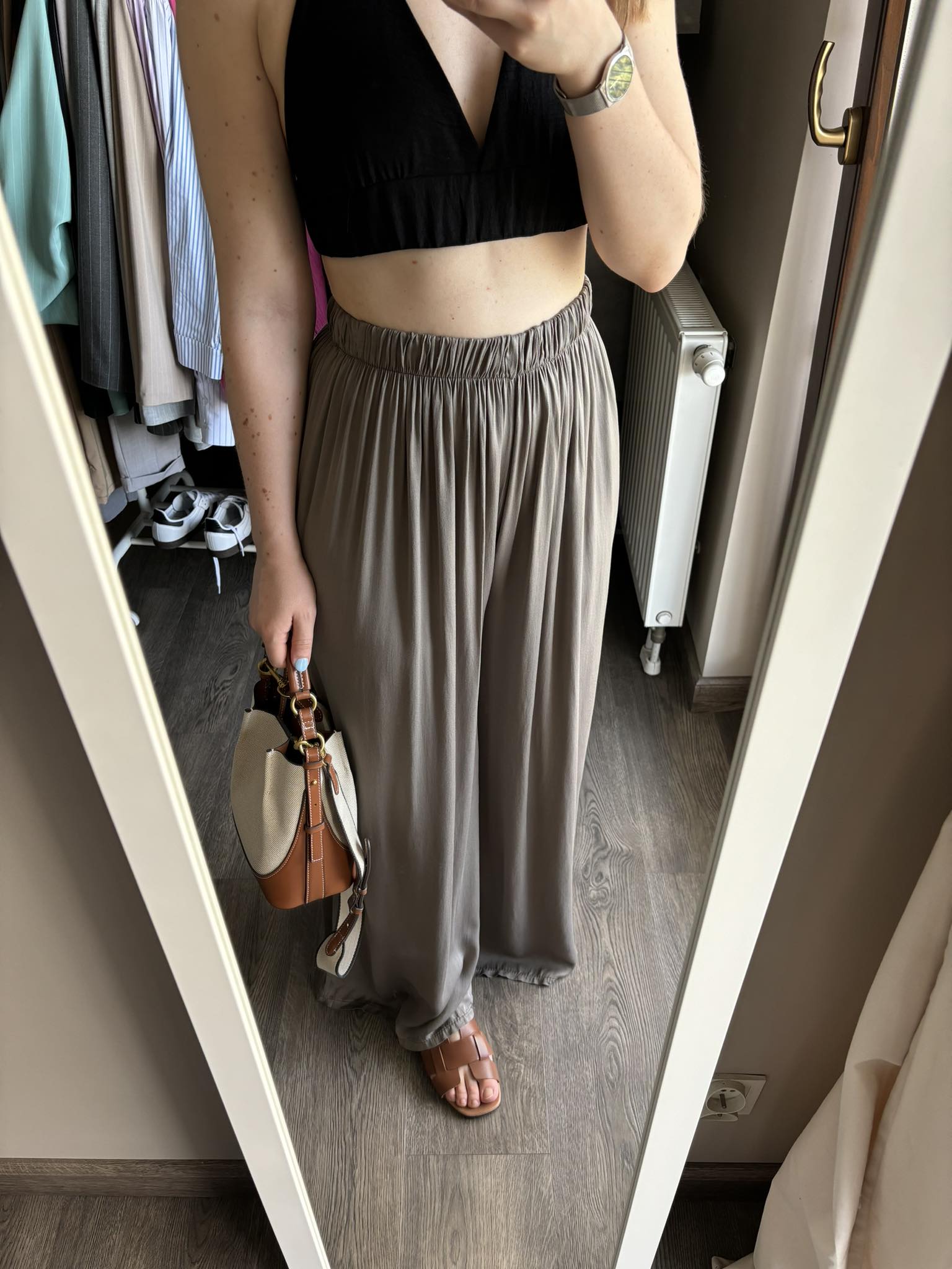 Dzięki szerokim, lejącym nogawkom spodnie pięknie układają się na sylwetce, dodając jej lekkości i szyku. Gumka w talii gwarantuje wygodne dopasowanie do różnych typów figury, dlatego model ten pasuje na rozmiary od XS do XXL. Neutralny kolor taupe, łączący odcienie beżu i szarości, to ponadczasowy wybór, który świetnie komponuje się zarówno z jasnymi, jak i ciemniejszymi dodatkami.