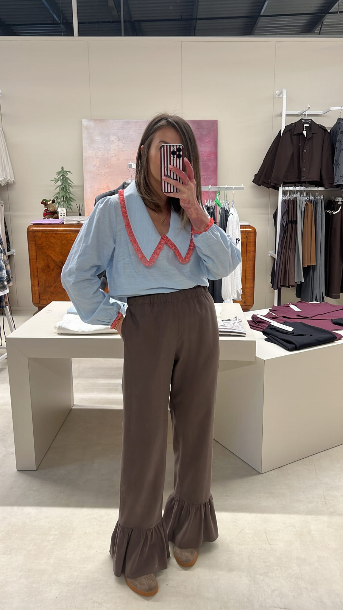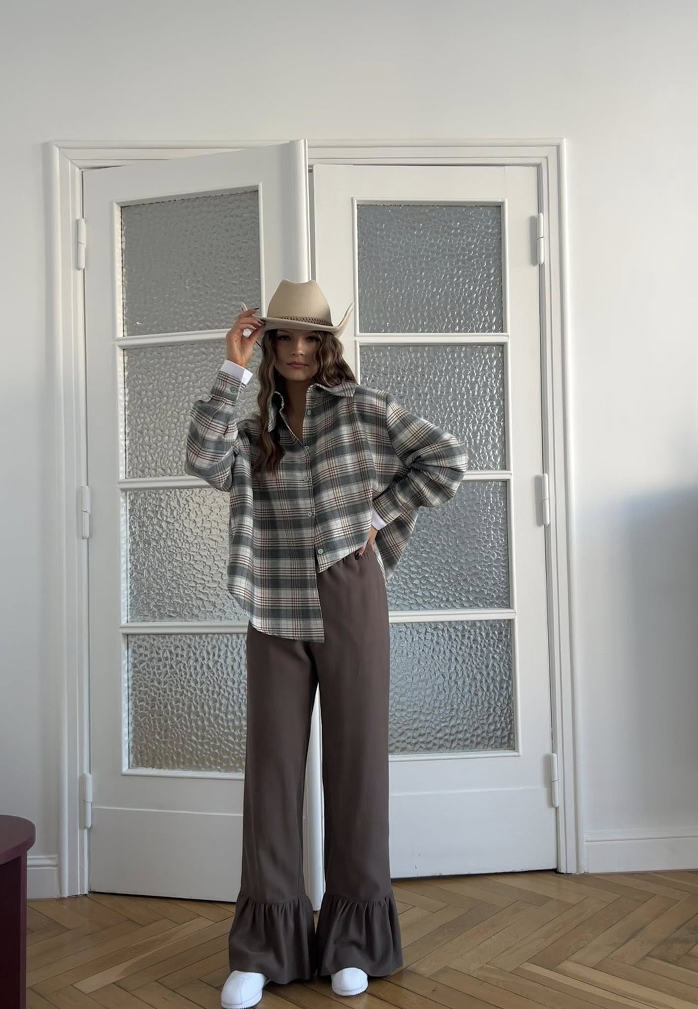 Do spodni z falbaną, dobierz nasze koszule Purpura z kołnierzykiem bądź klasyczne koszule w kratę od Purpury, tworząc zestawy, które łatwo będziesz mogła miksować bez zastanawiania się co z czym łączyć.