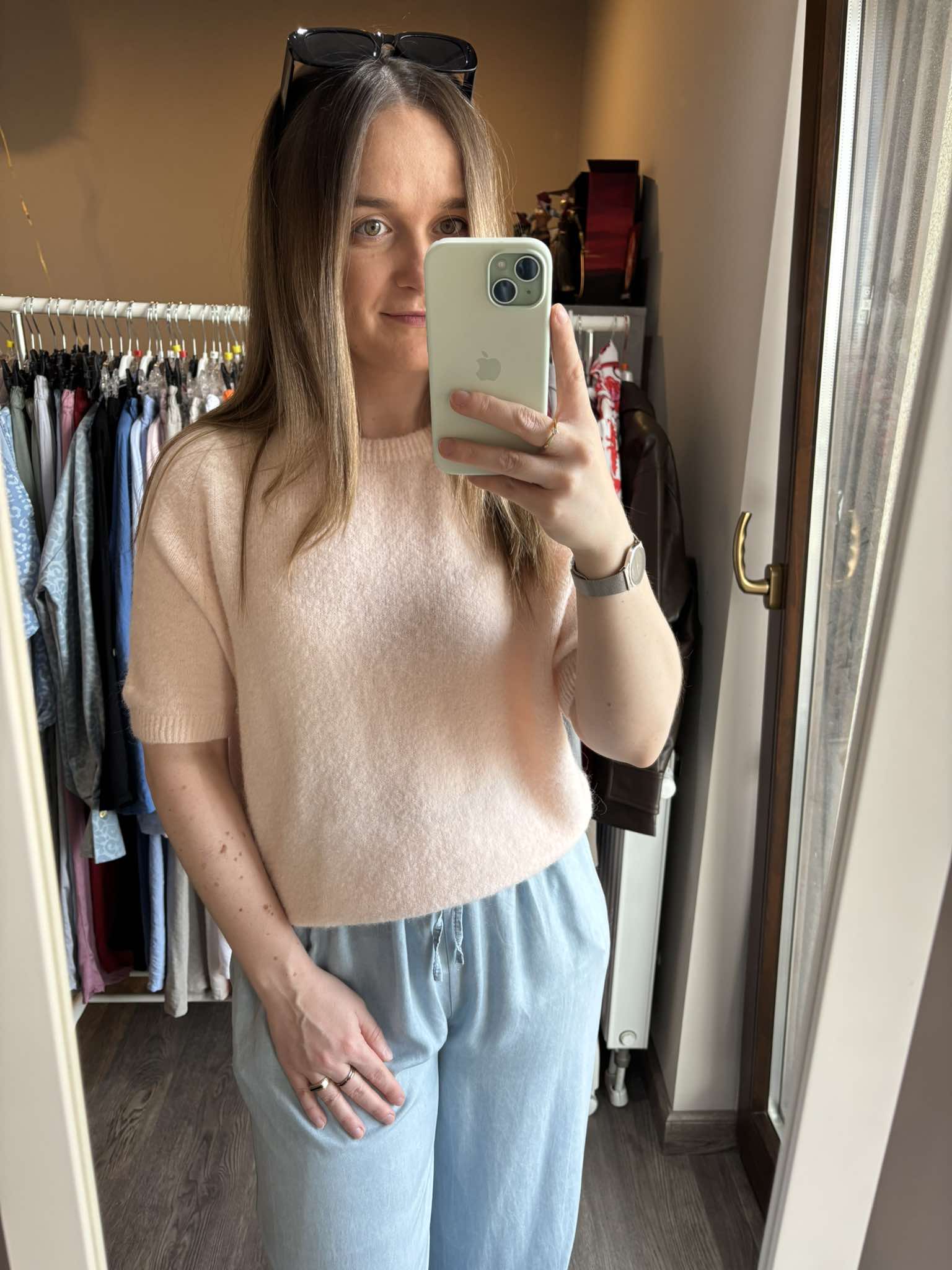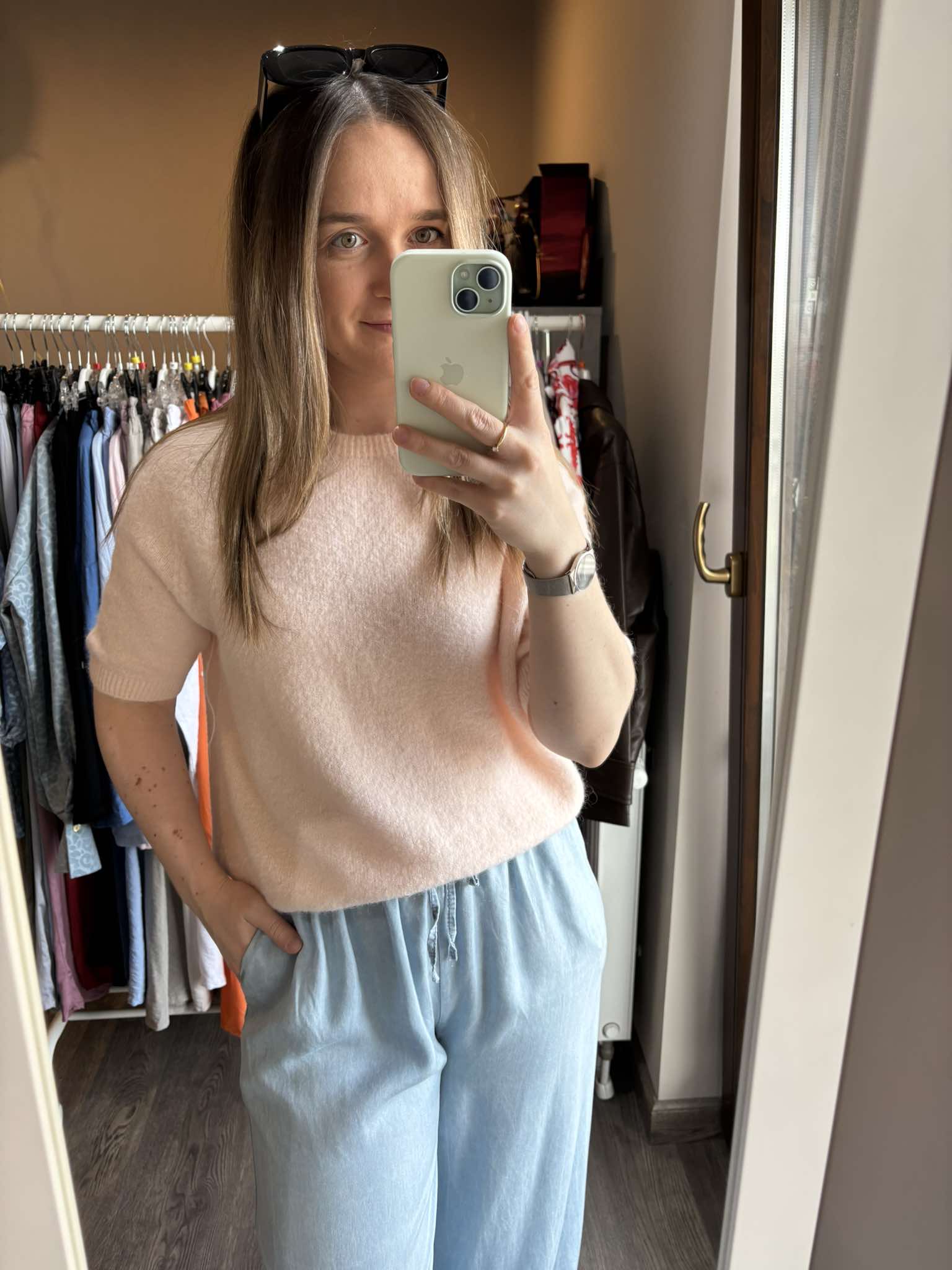 Sweter ma okrągły dekolt, który subtelnie podkreśla szyję, oraz krótkie rękawy, idealne na cieplejsze dni lub do warstwowych stylizacji. Jego klasyczny, minimalistyczny krój sprawia, że łatwo dopasujesz go zarówno do eleganckich, jak i casualowych outfitów. Pudrowy róż to uniwersalny, kobiecy kolor, który dodaje stylizacji lekkości i świeżości.