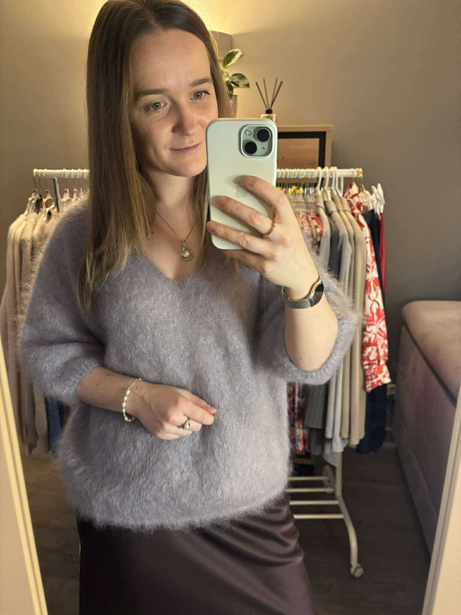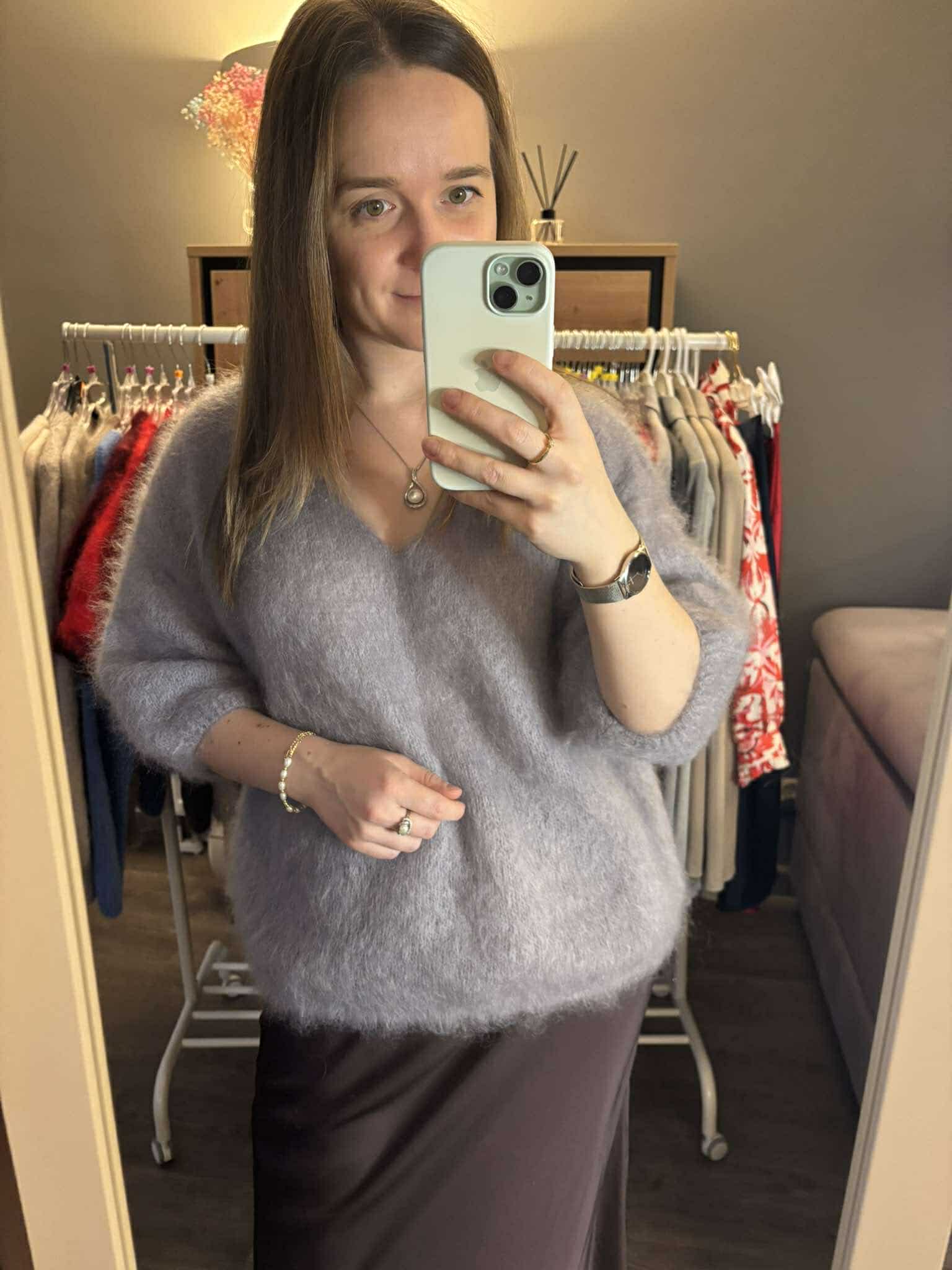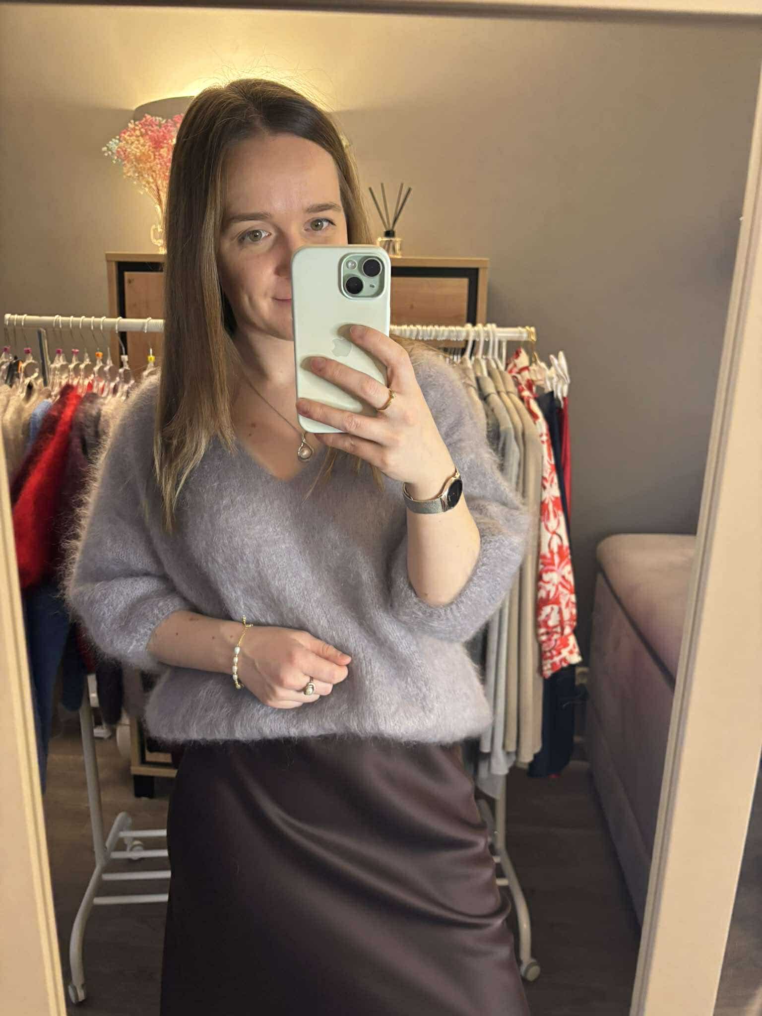 Dekolt w szpic subtelnie eksponuje szyję i ramiona, podkreślając kobiecość. Kolor szary to niezwykle wszechstronny odcień, który dodaje klasy i wyrafinowania, a jednocześnie może być bardzo nowoczesny, szczególnie w połączeniach z minimalistycznymi elementami. Taki sweter można zestawić z jeansami, spódnicą lub eleganckimi spodniami, tworząc różnorodne stylizacje na każdą okazję. Sweter kid moher jest produktem premium. To idealny wybór dla Pań, które cenią sobie zarówno styl, jak i komfort.